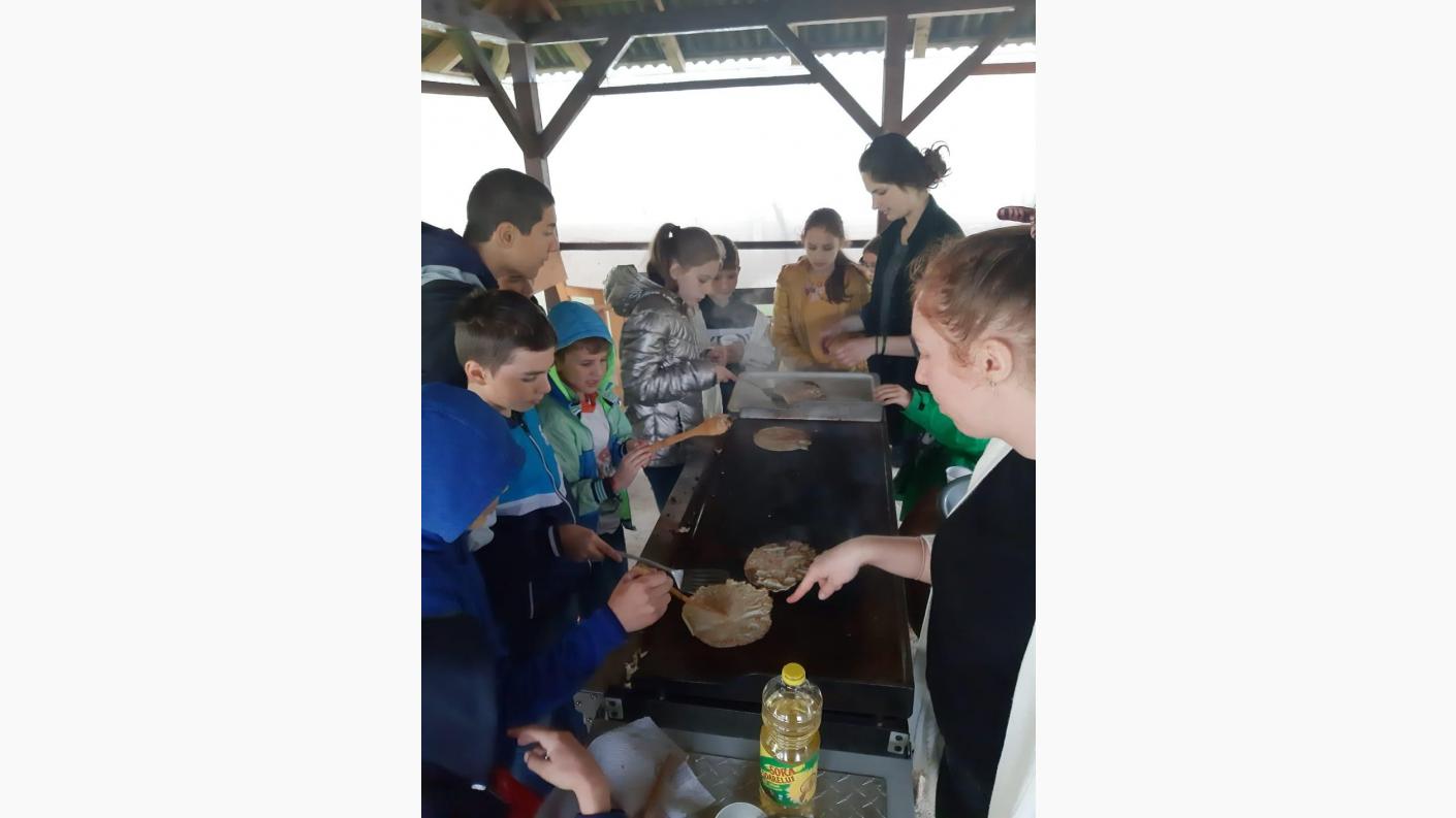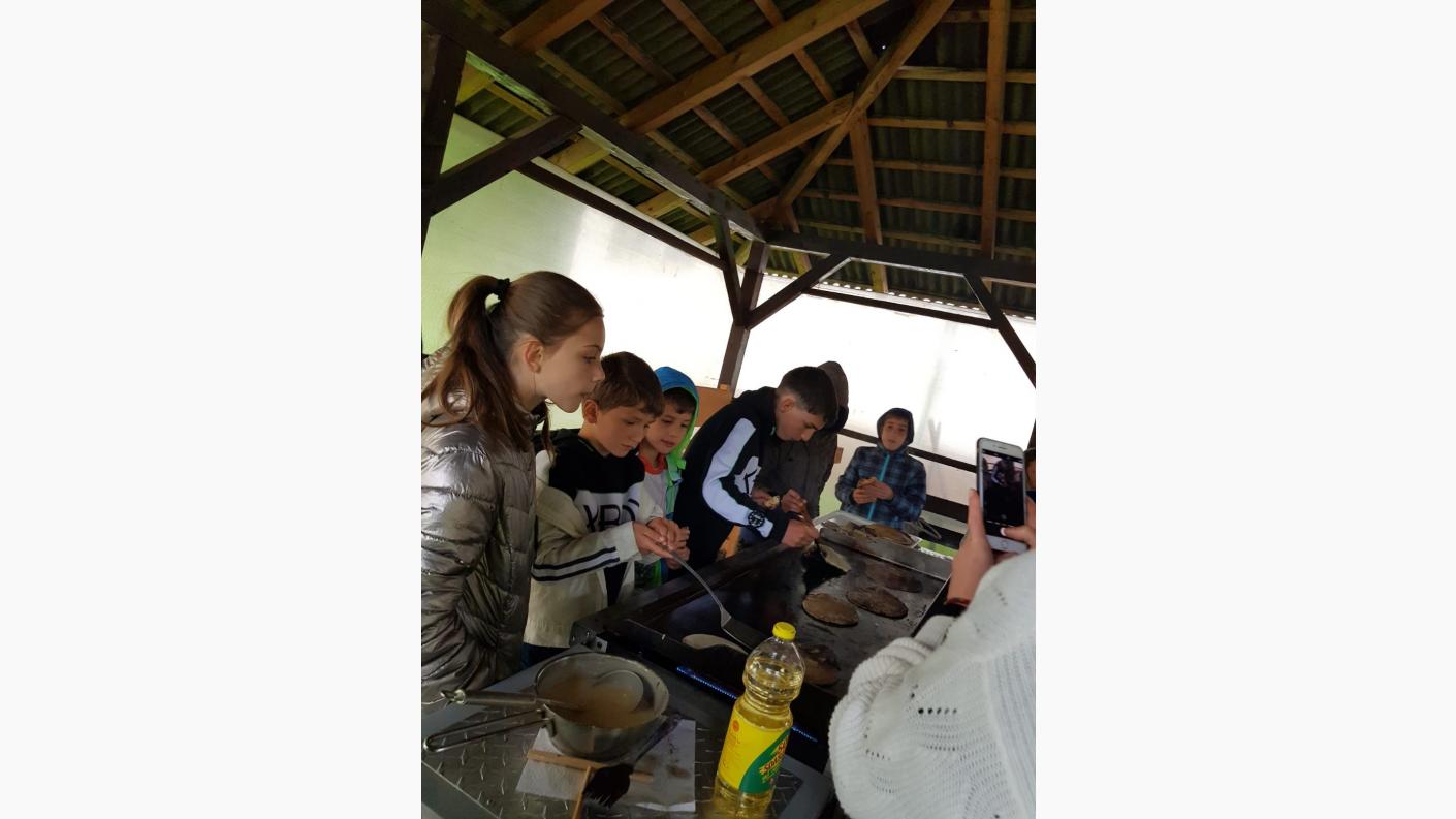 Sărbătoriţii au continuat programul cu jocuri şi voie bună, dansuri şi momente de karaoke, unde şi-au pus în valoare frumoasele voci care ne-au încântat de dimineaţă la Sfânta Liturghie. Punctul culminant s-a simţit mai apoi la atelierul de gătit clătite, când cei 30 de copii s-au „confruntat” cu o plită imensă în aer liber, în care au jonglat cu aluatul voioşi, dar cu o seriozitate de oameni mari, până la prepararea a 200 de clătite pe care le-au împărţit cu beneficiarii Complexului rezidenţial de persoane vârstnice – Hârja.