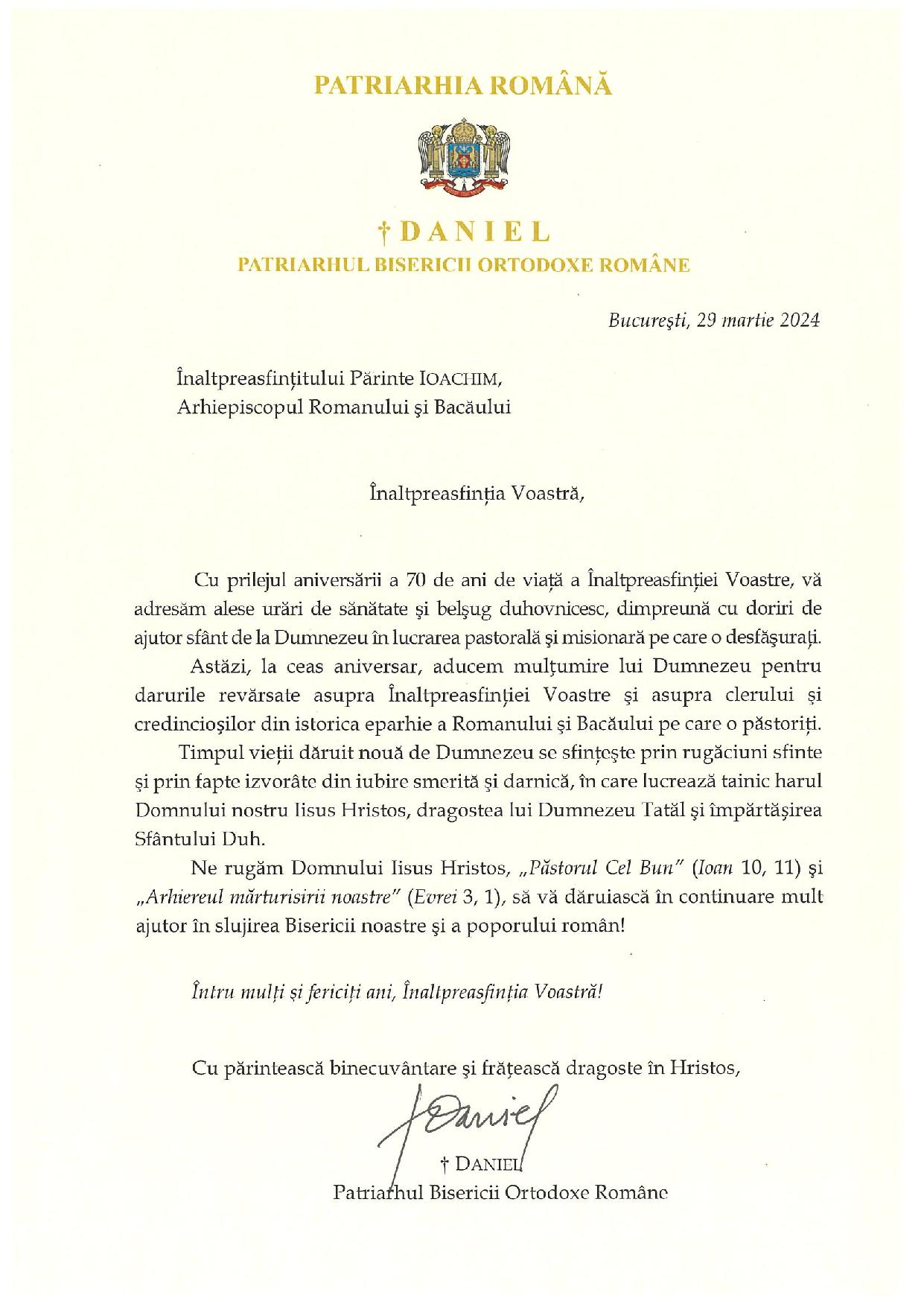 Mesajul PF Părinte Patriarh Daniel cu prilejul aniversării a 70 de ani de viață a IPS Părinte Arhiepiscop Ioachim