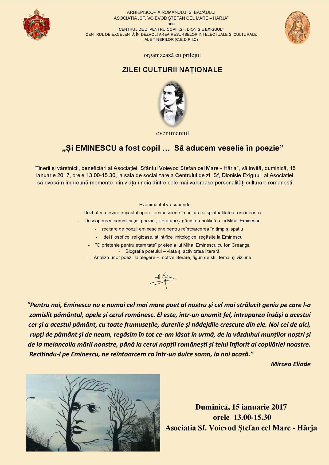 Duminică, 15 ianuarie, de Ziua Culturii Naționale, cu binecuvantarea Înaltpreasfințitului Parinte Ioachim, Arhiepiscopul Romanului și Bacăului,...