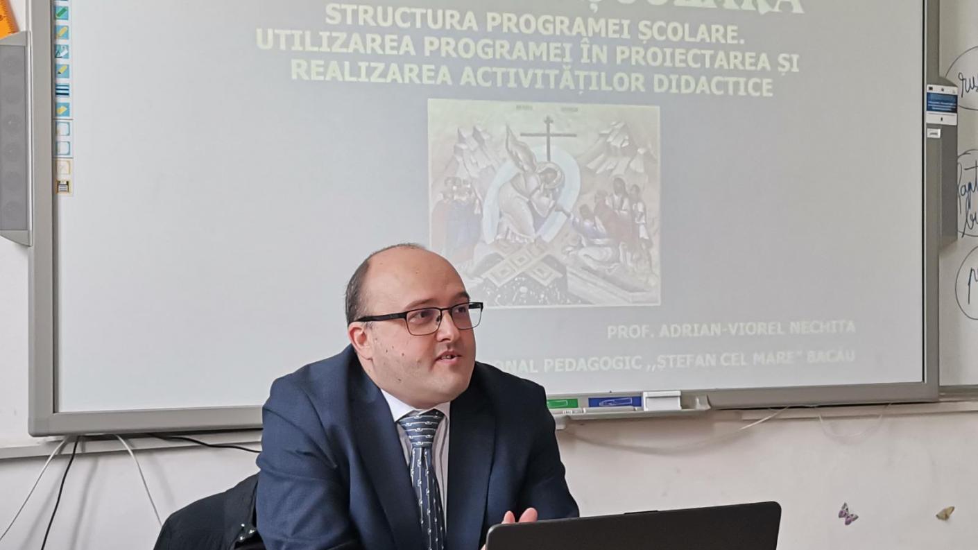 Ședința Cercului metodic „Preot profesor dr. Constantin Leonte”, dedicat colegiilor și liceelor băcăuane, aflat sub coordonarea doamnei profesoare Ciuche Gabriela, a avut loc la Colegiul Național Pedagogic ,,Ștefan cel Mare” Bacău. Ora demonstrativă cu tema ,,Mărturisirea credinței în Iisus Hristos” a fost susținută de domnul profesor Adrian-Viorel Nechita, la clasa a VI-a. Lecția s-a remarcat prin strategia didactică inovatoare, prin varietatea metodelor și a mijloacelor didactice folosite, prin activitățile de învățare diversificate, adaptate nivelului și specificității elevilor, dar și prin gradul ridicat de interactivitate și de implicare a elevilor în propria învățare. Ulterior a fost prezentat și referatul cu tema „Programa școlară: structura programei școlare. utilizarea programei în proiectarea și realizarea activităților didactice”. Plecând de la definiția programei școlare, domnul profesor Adrian-Viorel Nechita a prezentat caracteristicile programei școlare, programele școlare în vigoare la disciplina Religie, structura programei la ciclurile primar, gimnazial și liceal, modalități de abordare a programelor, un model de proiectare didactică a planificărilor anuale, modulare și pe unități de învățare, precum și un exemplu de corelare între componentele programei școlare și o secvență de lecție.