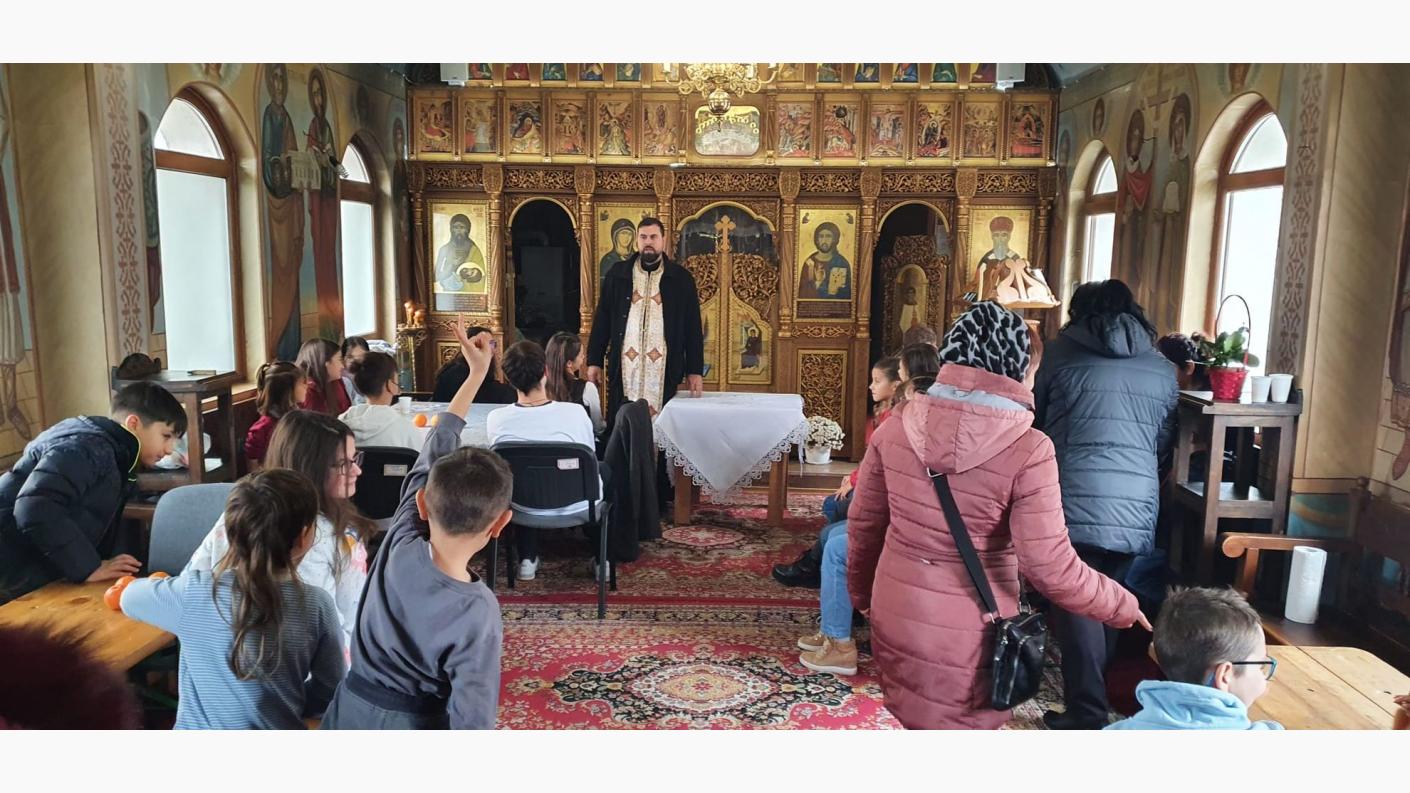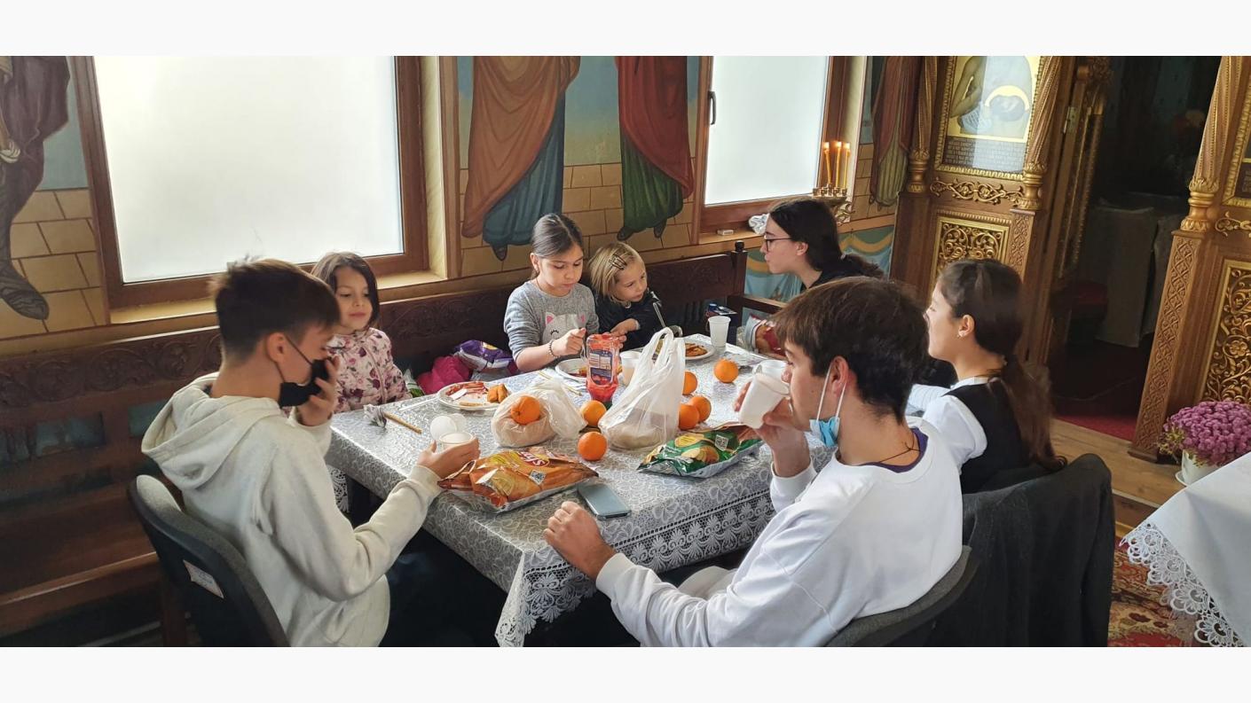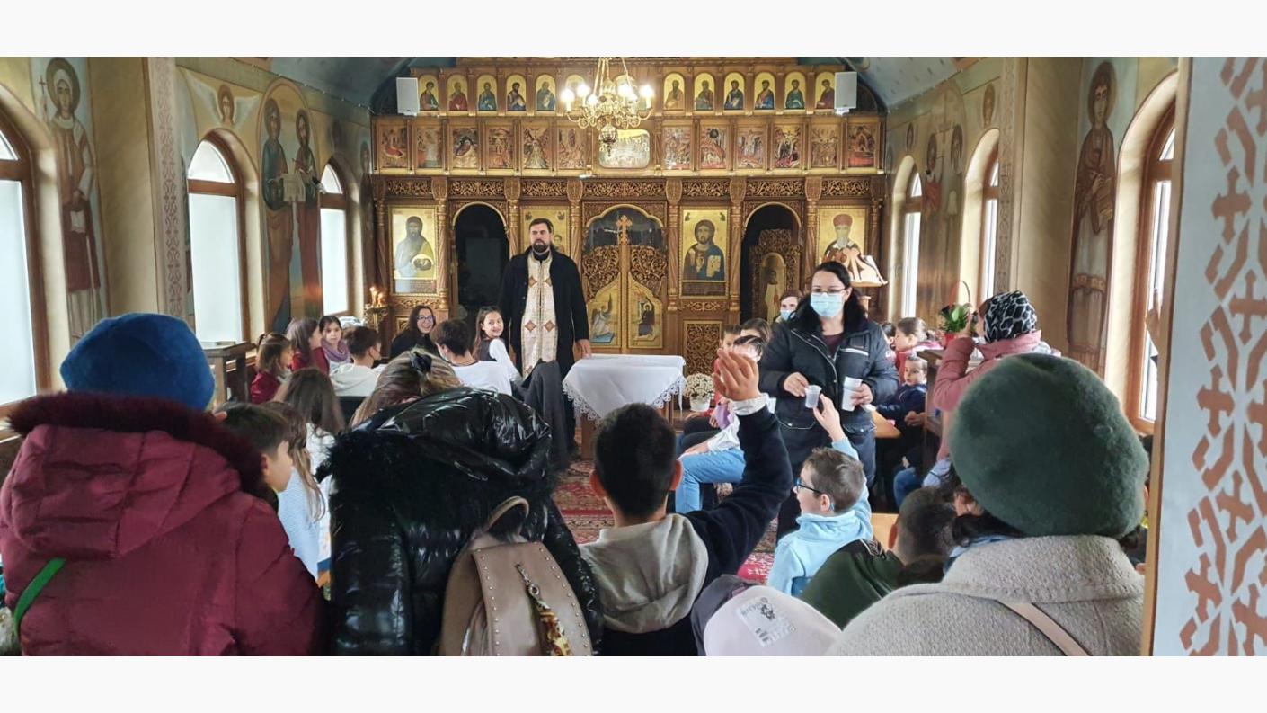 Începând cu ora 09.30 copiii au ajuns la Sfânta Liturghie, o parte dintre aceștia ajutând preoţii la activităţile liturgice. Astfel, tinerii sunt apropiaţi de Dumnezeu, iar în acelaşi timp sunt responzabilizaţi prin îndeplinirea unor sarcini în sfântul lăcaș. La sfârşitul slujbei, tinerii au fost aşezaţi la o agapă în cadrul căreia s-au bucurat atât de dezlegarea la peşte, cât şi de colăcelul şi coliva primite. Părintele Ionuț le-a vorbit tinerilor despre personalitatea Sfântului Apostol Andrei, i-a prezentat pe cei cinci copii din centru care îi poartă numele şi ţinând icoana sfântului în mână, le-a vorbit despre viaţa acestuia şi despre drumurile de propovăduire a Evangheliei, care au ajuns până în Dobrogea. Toate aceste trăsături ale sfântului au fost prezentate copiilor, ca prin ochişorii lor de mici creștini să poată porni în pictarea icoanei.
