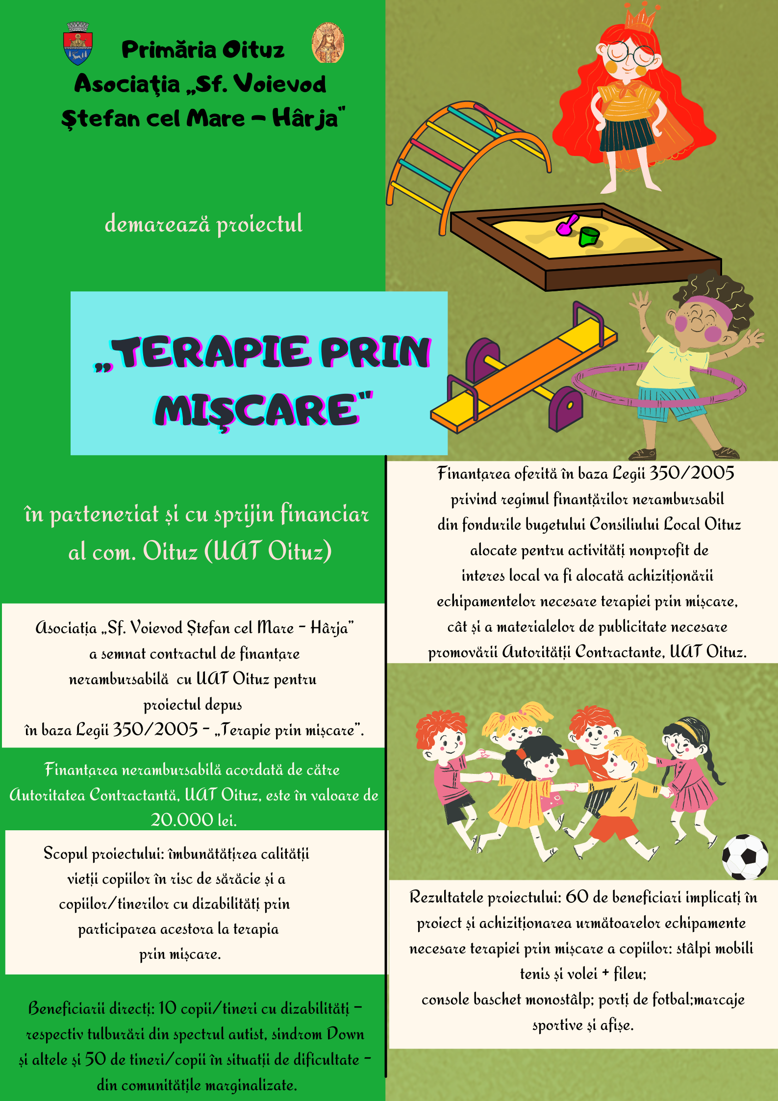 Asociația „Sf. Voievod Ștefan cel Mare - Hârja” derulează proiectul intitulat „Terapie prin mișcare” desfășurat în parteneriat și cu cofinanțarea UAT...