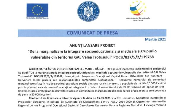 ASOCIAȚIA "SFÂNTUL VOIEVOD STEFAN CEL MARE - HÂRJA" – AFJ anunță începerea implementării proiectului cu titlul: ”De la marginalizare la integrare...