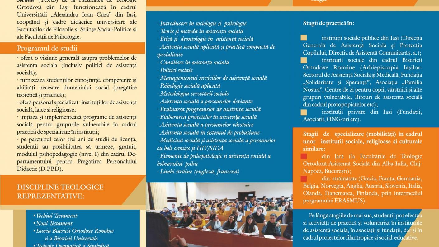 În tendița evidentă de secularizare a lucrării sociale din comunitățile ecleziale, Facultatea de Teologie Ortodoxă de la Iași, vine cu propunerea unei forme de învățământ superior care să pregătească viitorii teologi asistenți sociali. Absolvenții acestei duble specializări vor fi pregătiți să se implice atât în plan spiritual, cât și social, în lucrarea misionar - pastorală și social - filantropică a parohiilor și ONG-urilor eparhiilor. Dacă la nivel național, în Patriarhia Română funcționeză peste 800 de servicii și instituții de caritate, este dovada certă că Biserica Ortodoxă Română și-a asumat o mare misiune, aceea de a purta de grijă nu numai nevoilor spirituale ale credincioșilor prin opera sfințitoare ( fiind lucrarea esențială a Bisericii), cât și celor materiale, medicale, sociale și educaționale. În rapoartele anuale de activitate ale Patriarhiei Române, vedem de la an la an o creștere evidentă a interesului clericilor și membrilor comunităților ecleziale de a oferi sprijin copiilor, tinerilor, familiiliei tradiționale și vârstnicilor, indiferent de condiția socio-profesională sau etnică a credincioșilor din parohie.