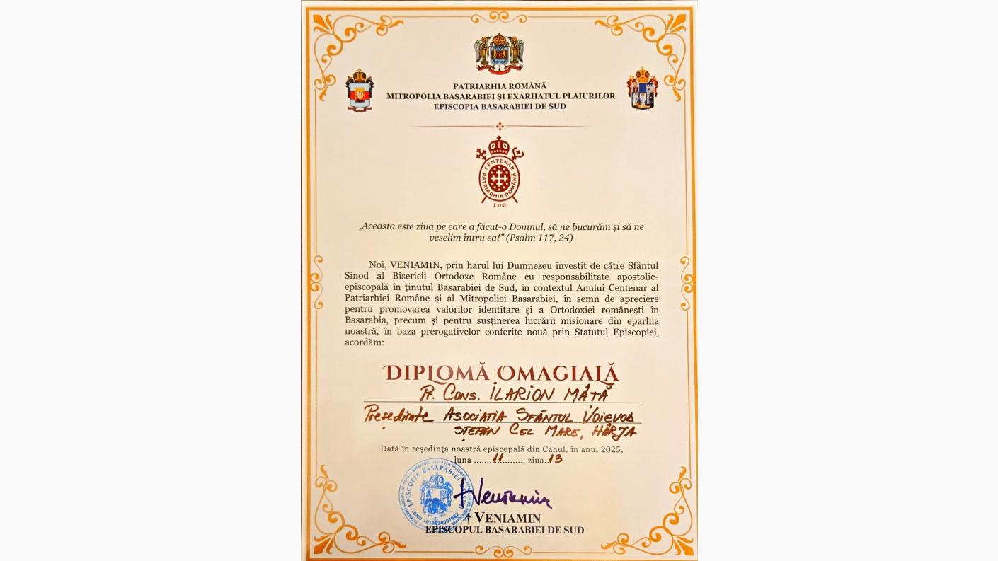 - De asemenea Pr. Ilarion Mâță și Asociației „Sfântul Voievod Ștefan cel Mare – Hârja”, care a primit Diploma Omagială din partea Episcopiei Basarabiei de Sud, în semn de recunoaștere a implicării în promovarea valorilor creștine și a lucrării sociale în rândul comunităților din țară și din Republica Moldova. În cadrul ședinței solemne, această distincție a fost oferită pentru implicarea în misiunea socială desfășurată în cadrul eparhiei basarabene, pentru contribuția la formarea clericilor acestei eparhii și pentru sprijinirea proiectelor sociale și educaționale susținute în Basarabia, cu binecuvântarea Înaltpreasfințitului Părinte Ioachim.