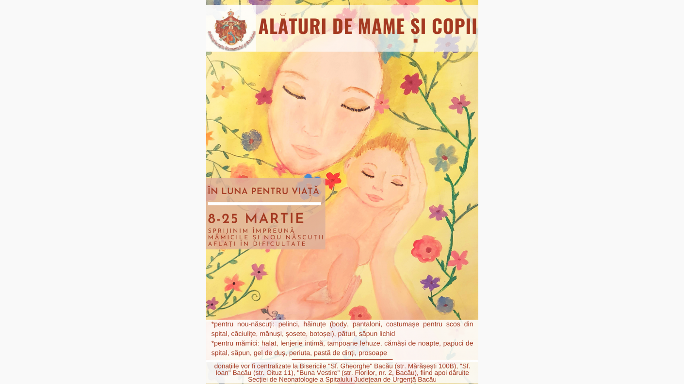 În Luna pentru Viață, în perioada 8-25 martie, la bisericile băcăuane "Sf. Gheorghe" (str. Mărășești 100B), "Sfântul Ioan" (str. Oituz nr. 1) și “Buna Vestire” (Str. Florilor nr. 2) s-au organizat colecte destinate mamelor și nou-născuților aflați în dificultate, care ajung la Secția de Neonatologie a Maternității Spitalului Județean de Urgențe Bacău.