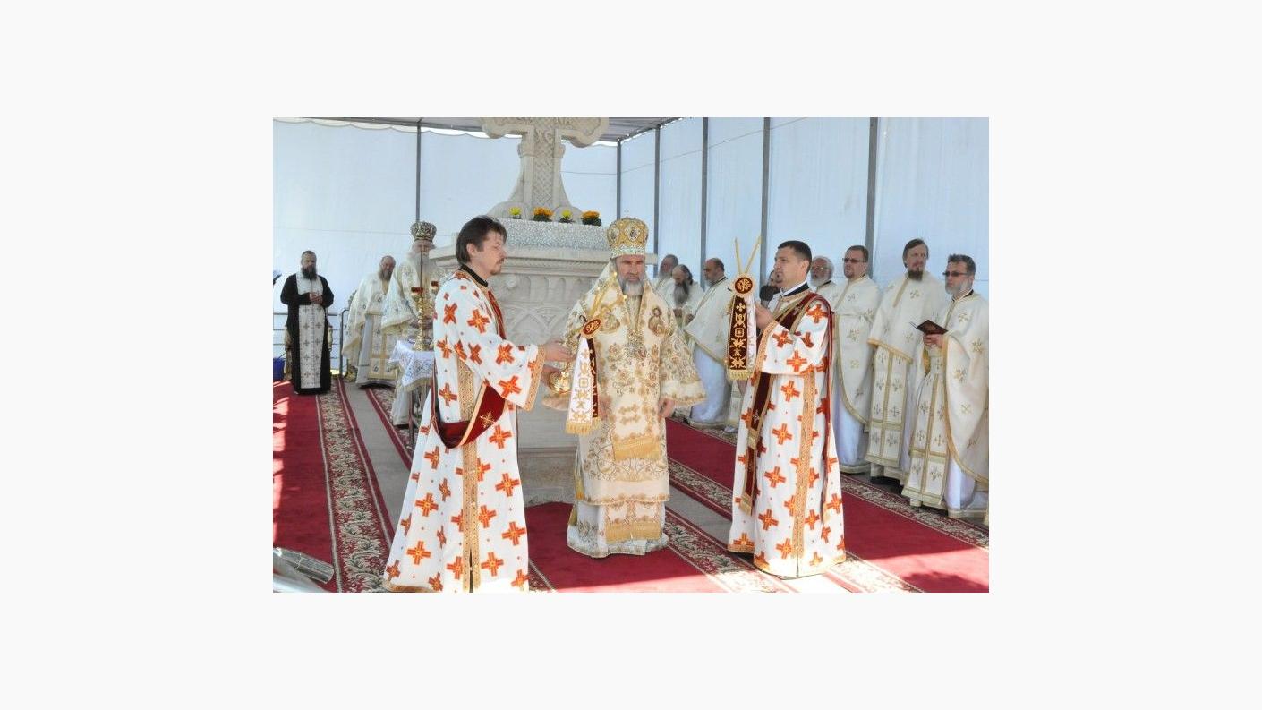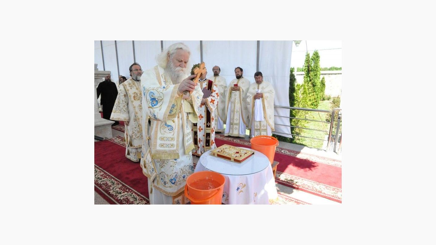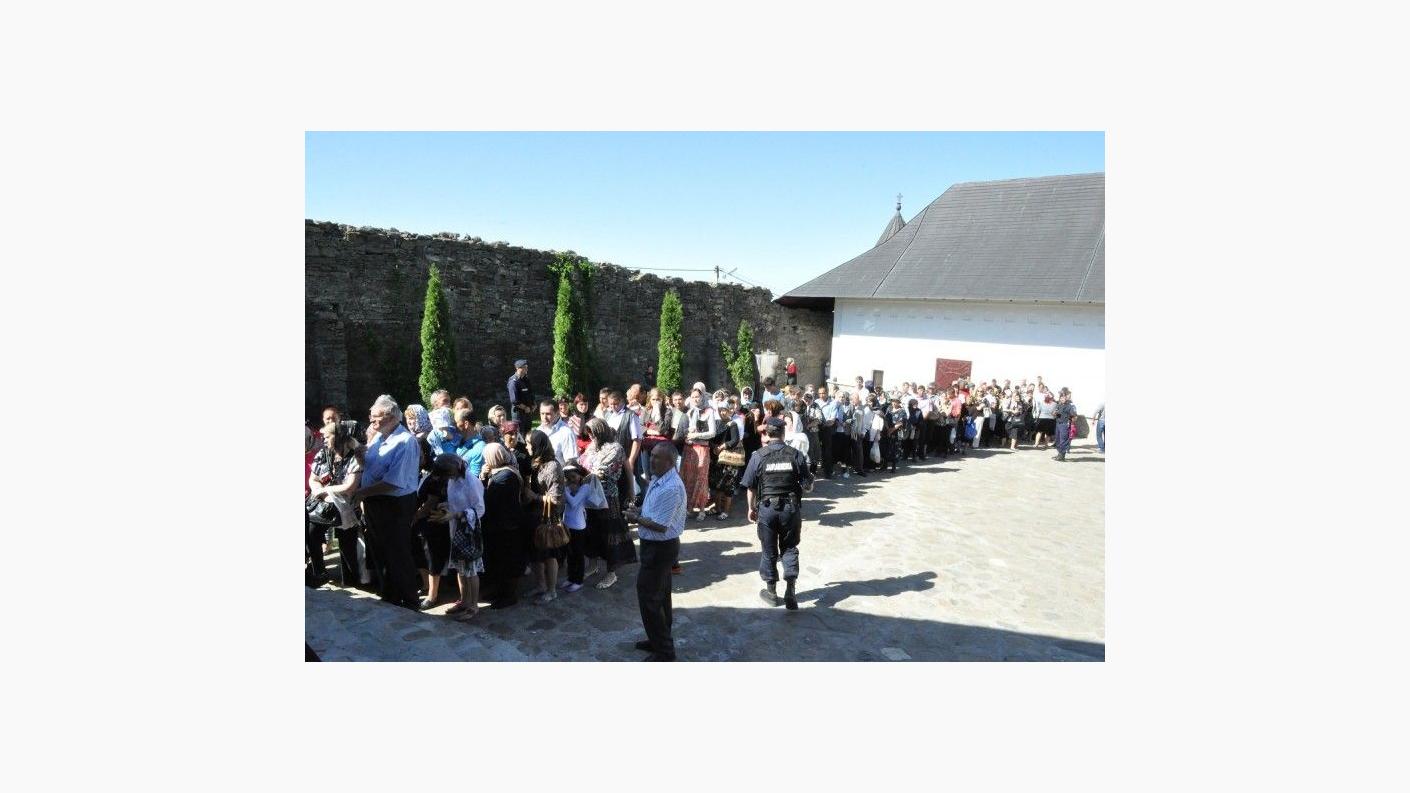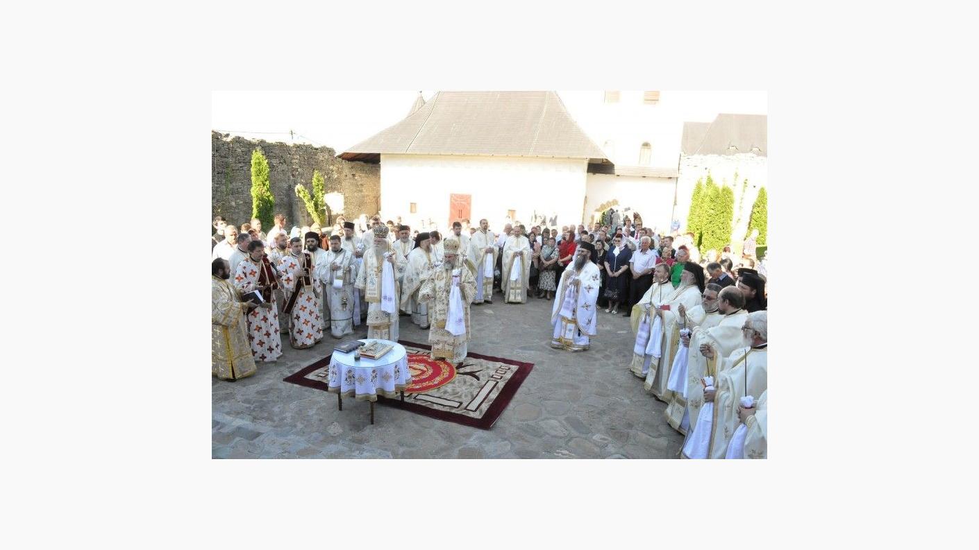 Sfânta Liturghie a fost săvârşită de PS Calinic Botoşăneanul şi de PS Ioachim Băcăuanul, alături de soborul de preoţi şi diaconi, pe o scenă amenajată în curtea aşezării monahale. Din soborul slujitorilor au făcut parte părinţi stareţi şi preoţi parohi din toată Mitropolia Moldovei şi Bucovinei. Slujba s-a bucurat de prezenţa unui număr mare de credincioşi. La acest moment de sărbătoare au venit mulţi dintre fiii duhovniceşti ai arhimandritului Nicodim Gheorghiţă, stareţul Mănăstirii Hadâmbu, care ajută aşezarea monahală în lucrarea misionară şi mai ales social-filantropică. Pelerinilor prezenţi la Sfânta Liturghie s-au adăugat copiii de la şcoala din localitate, însoţiţi de cadrele didactice. PS Calinic Botoşăneanul şi PS Ioachim Băcăuanul, împreună cu soborul de preoţi şi diaconi, au oficiat în continuare Agheazma mică din ziua Izvorului Tămăduirii. PS Calinic Botoşăneanul a acordat prof. univ. dr. Vasile Burlui distincţia "Sfântul Ierarh Dosoftei", din partea Înalt Preasfinţitului Teofan. De asemenea, Vasile şi Ana Onică au primit Distincţia de vrednicie "Ştefan cel Mare şi Sfânt".