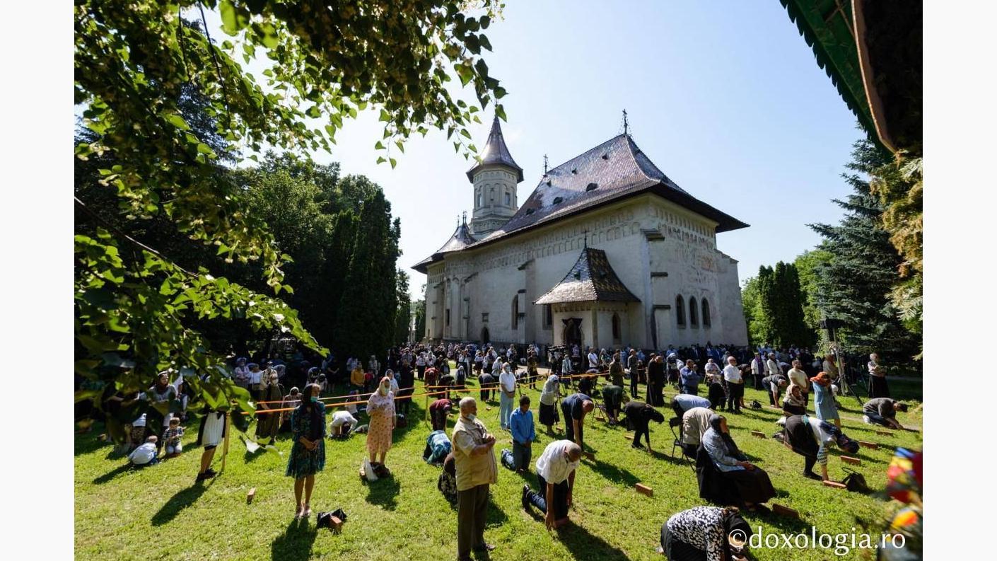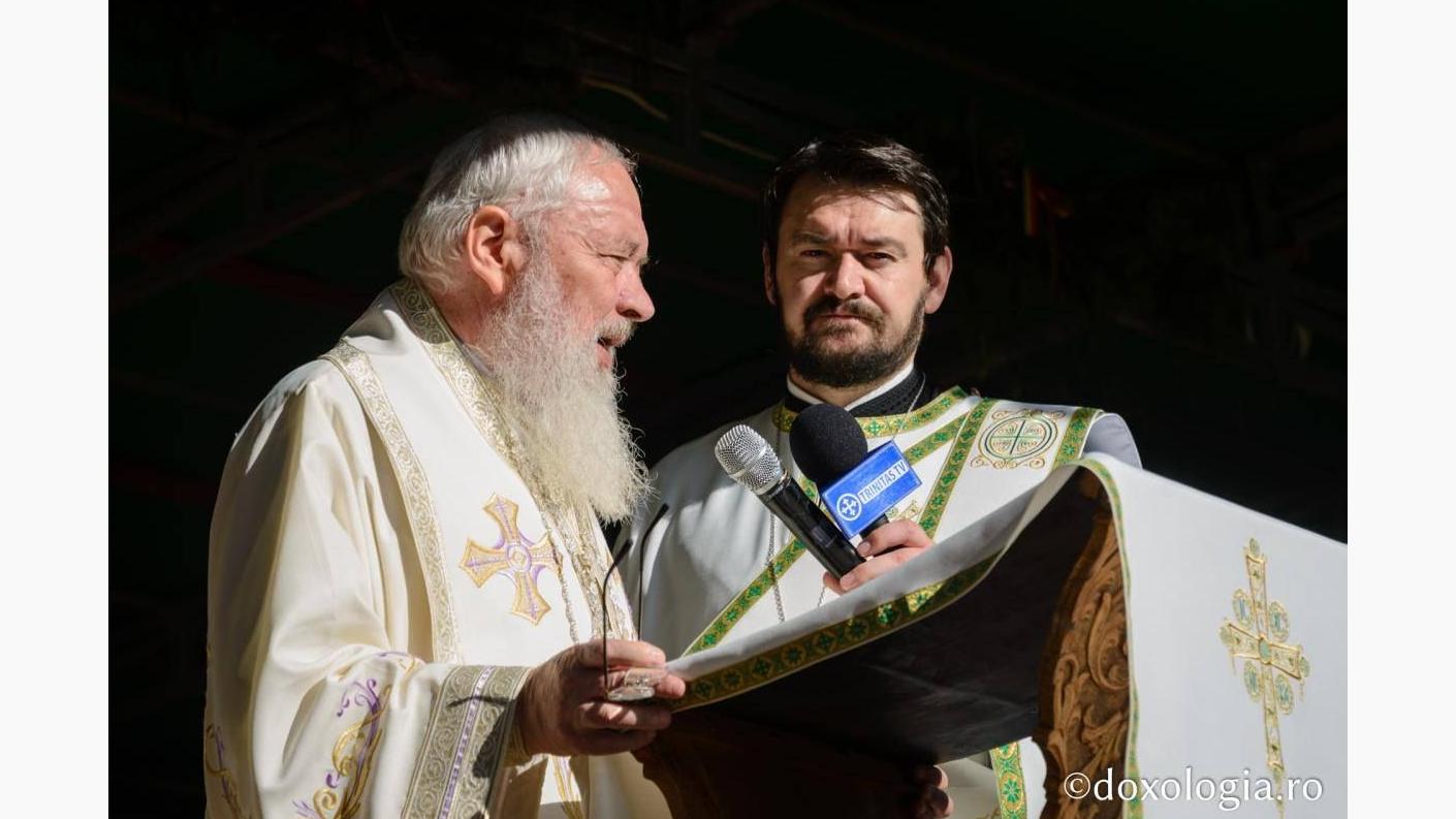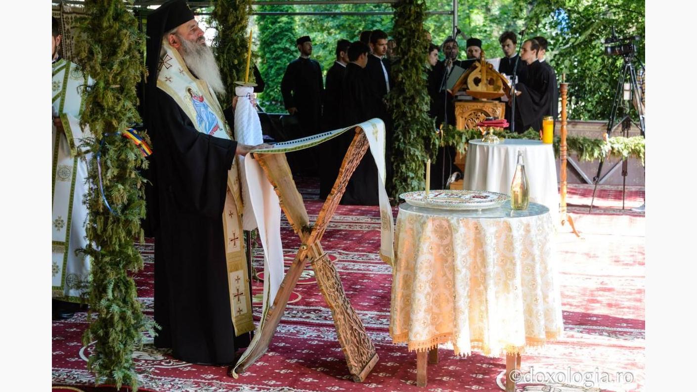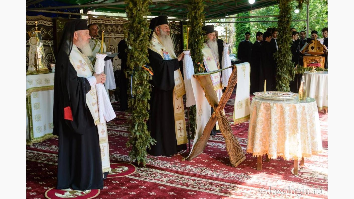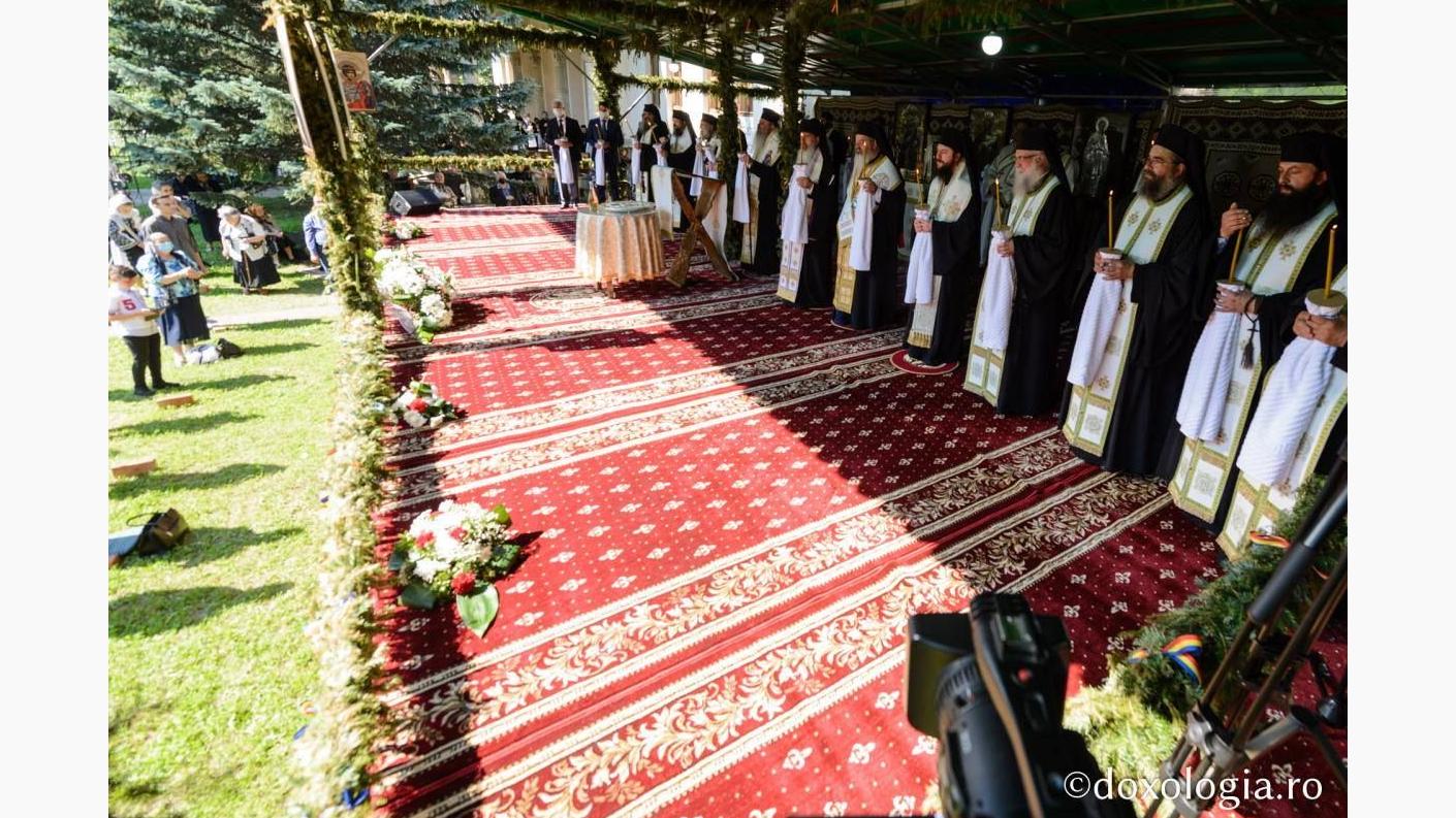 Sfânta Liturghie a fost săvârșită pe o scenă special amenajată în curtea așezământului monahal, de către Înaltpreasfințitul Părinte Teofan, Arhiepiscopul Iașilor și Mitropolitul Moldovei și Bucovinei, alături de Înaltpreasfințitul Părinte Andrei, Arhiepiscopul Vadului, Feleacului și Clujului și Mitropolitul Clujului, Maramureșului și Sălajului, Înaltpreasfințitul Părinte Teodosie, Arhiepiscopul Tomisului, Înaltpreasfințitul Părinte Ioachim, Arhiepiscopul Romanului și Bacăului, Preasfințitul Părinte Ignatie, Episcopul Hușilor, Preasfințitul Părinte Macarie, Episcopul Europei de Nord, Preasfințitul Părinte Damaschin Dorneanul, Episcopul-vicar al Arhiepiscopiei Sucevei și Rădăuților.
