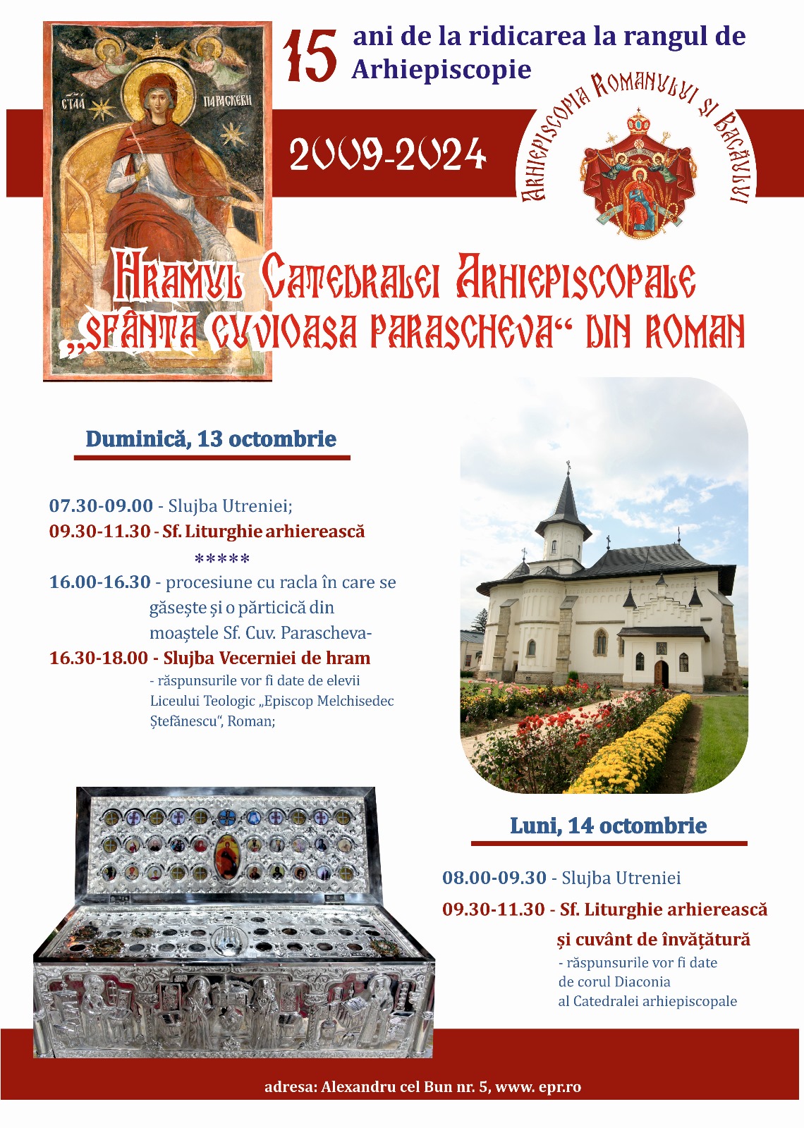 În perioada 13-14 octombrie, la Catedrala arhiepiscopală din Roman vor fi săvârșite slujbe speciale dedicate sărbătorii Sfintei Cuvioase Parascheva,...