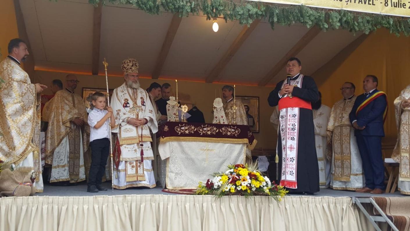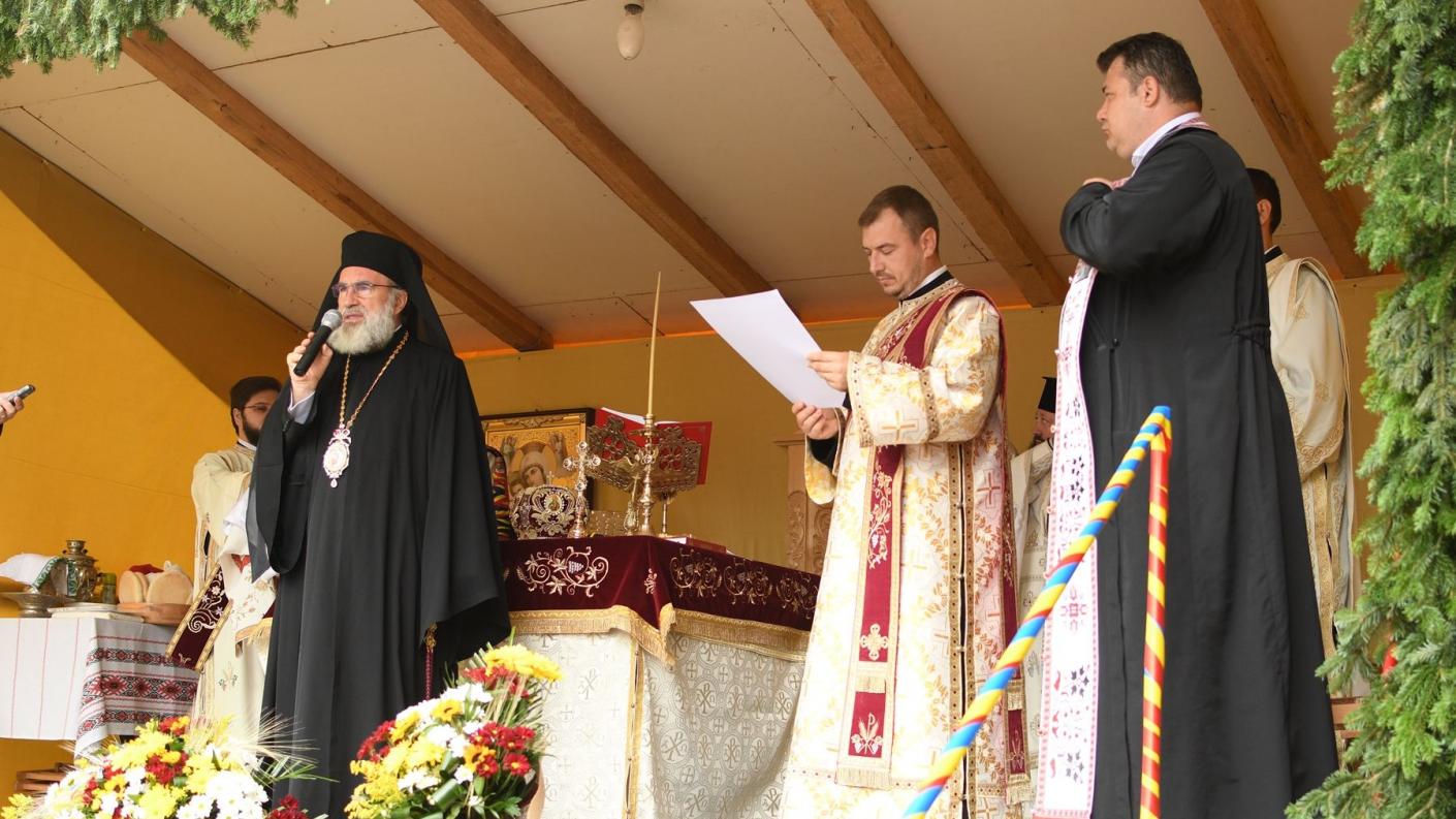 A urmat Sfânta Liturghie arhierească oficiată pe scena special amenajată pentru acest important eveniment, la care au participat alături de ierarh, Părintele Arhimandrit Serafim Huzdup, consilier eparhial, părintele protoiereu Costel Mareş, împreună cu un sobor de preoţi și diaconi, şi numeroşi credincioşi veniți la sărbătoarea comunității.