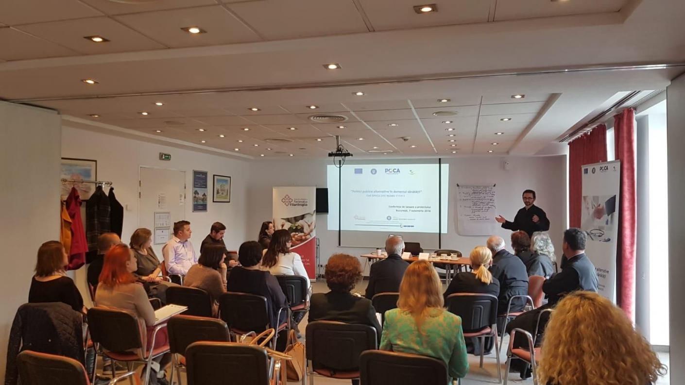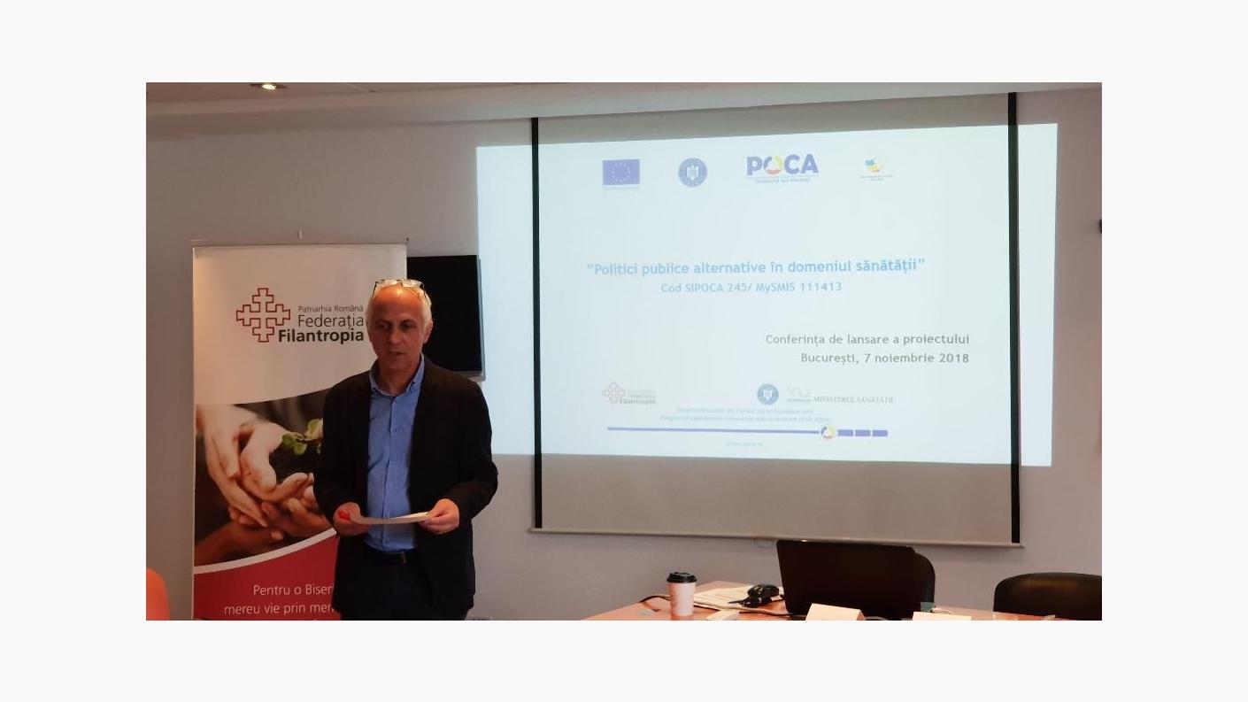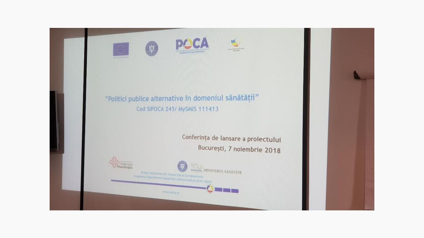 Conferința de lansare a proiectului “Politici publice alternative în domeniul sănătății” (Cod SIPOCA/ MySMIS: 245/ 111413), a avut loc la București și a constat în expunerea liniilor directoare de către Managerul de proiect - Olivia Bîrdici, prezentarea programelor sociale ale Patriarhiei Române de către Pr. Cons. Patriarhal Ciprian Ioniță - Președintele Federației Filantropia și expunerea Strategiei Naționale 2014-2020 a Ministerului Sănătății, de către Dr. Daniela Cîrlan.