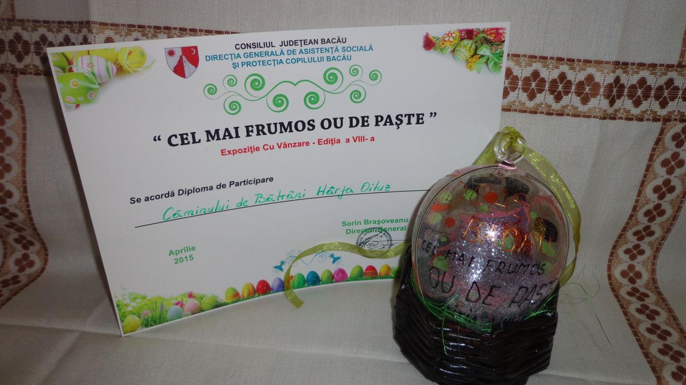 Reprezentanţii asociației ”Sf. Voievod Ștefan cel Mare – Hârja”, membră a Federației Filantropiei a Patriarhiei Române, cu binecuvântarea Înalpreasfințitului Părinte Ioachim, Arhiepiscopul Romanului și Bacăului, au luat parte în data de 08 aprilie 2015, pentru a doua oară la evenimentul ”Cel mai frumos ou de Paște” organizat și sprijinit de Consiliul Județean Bacău și Direcția Generală de Asistență Socială și Protecția Copilului Bacău, eveniment ce se află deja la cea de-a VIII a ediție.