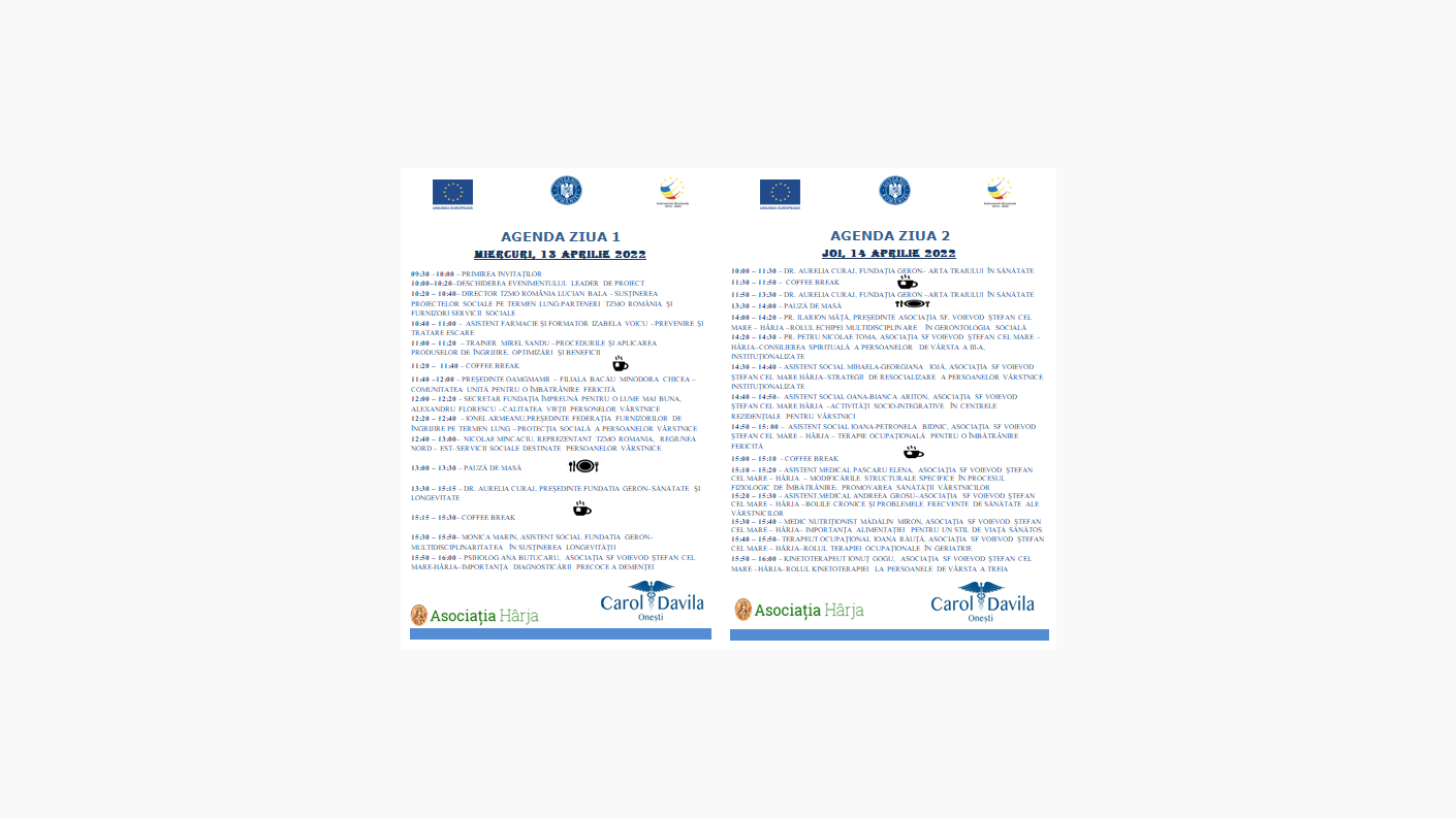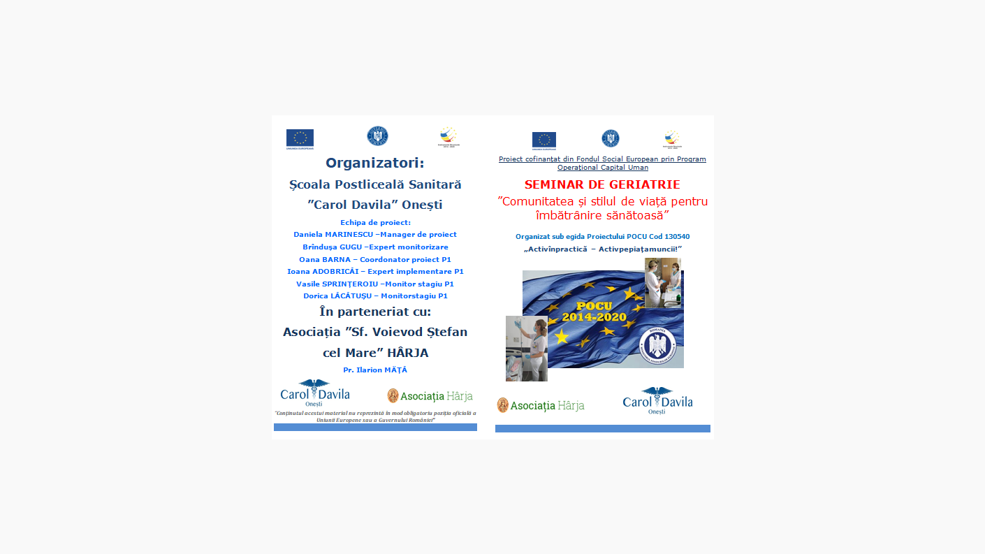 Simpozionul se desfășoară în parteneriat cu Școala Sanitară „Carol Davila” Onești, sub genericul „Comunitatea și stilul de viață pentru îmbătrânire sănătoasă”. Drept urmare, organizatorii va invită la evenimentul ce va avea loc la Aula Bibliotecii „Radu Rosetti” a Municipiului Onești și care va reuni un număr de 20 de conferențiari din diferite domenii precum: medicină (geriatrie, paliație, farmacologie, nutriție), asistență socială (gerontologie socială), psihoterapie, kinetoterapie, training, formare profesională, management și terapie ocupațională. Programul zilnic al simpozionului se desfășoară între orele 10:00 – 16:00, conform agendei atașate.