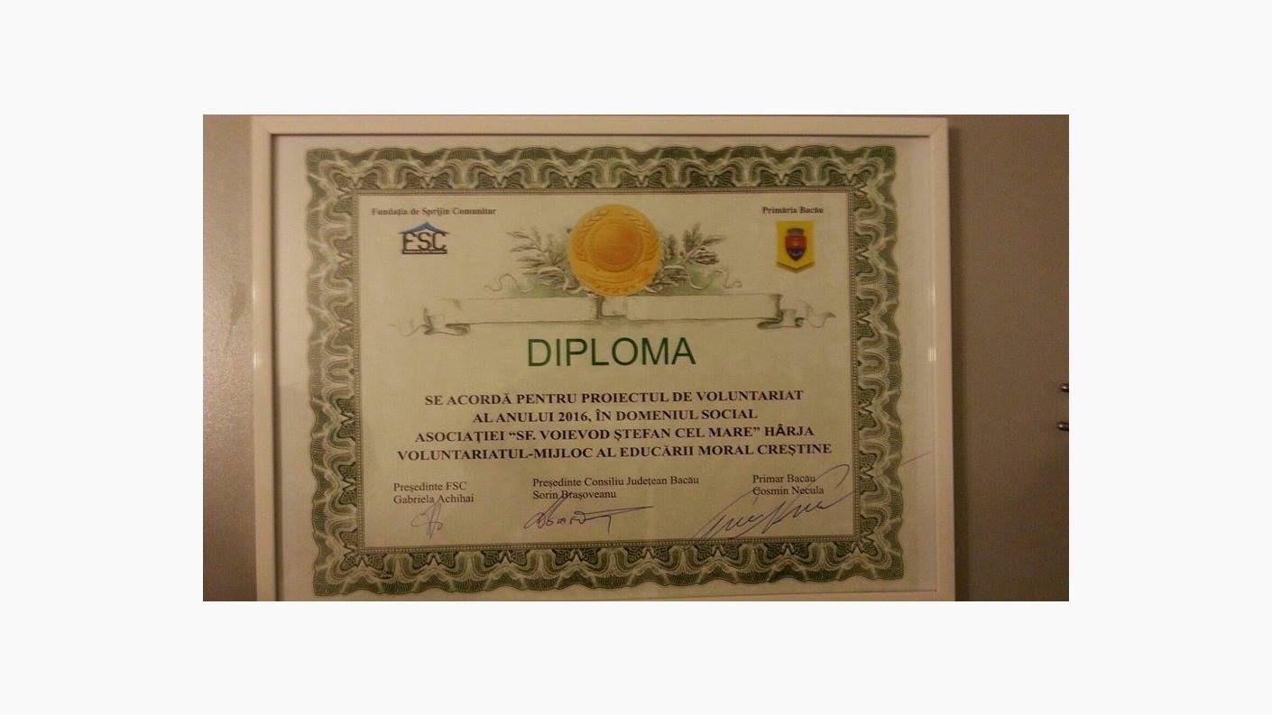 Asociația „Sf. Voievod Ștefan cel Mare - Hârja” a fost premiată cu locul I la categoria Proiectul de voluntariat al anului 2016, în domeniul social. Activitatea care a adus acest premiu de recunoștință a fost „Voluntariatul - mijloc al educării moral-creștine” în care au fost implicate centrele de tineret și voluntariat ale asociației - „Sf. Filofteia” în parteneriat cu Colegiul Național „Grigore Moisil” Onești, „Sf. Dimitrie Izvorâtorul de Mir” în parteneriat cu Colegiul Național „Dimitrie Cantemir” Onești și „Sf. Trei Ierarhi” în parteneriat cu Colegiul Tehnic „Gheorghe Asachi” Onești și Parohia „Sf. Împărați Constantin și Elena”, Protopopiatul Onești.