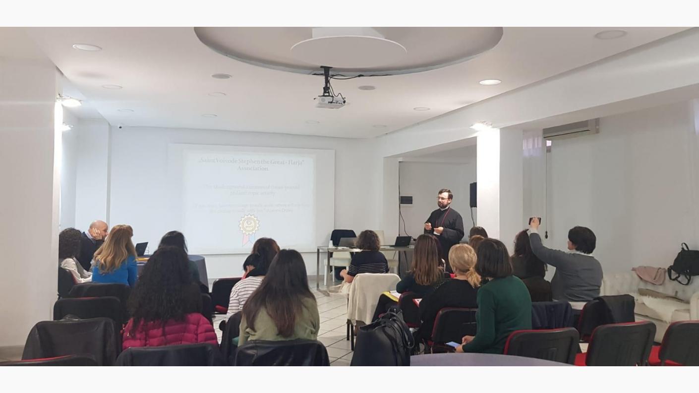 Părintele Ilarion Mâță, Inspector eparhial la Sectorul Social – Filantropic al Arhiepiscopiei Romanului și Bacăului și cadru didactic universitar asociat al Secției de Teologie Ortodoxă Asistență Socială din cadrul Facultății „Dumitru Stăniloae” din Iași, a afirmat următoarele : „ Experiența din Palermo a fost una utilă deoarece am luat contact cu realitățile sociale ale colegilor din țările partenere ale acestui proiect, Italia și Portugalia. Atelierele de lucru au avut scopul identificării resurselor personale și organizaționale ce pot fi puse în slujba formării asistenților sociali, a lucrătorilor sociali a personalului ce activează în centrele inființate de organizațiile Patriarhiei Române. Aducem mulțumire Părintelui Patriarh Daniel pentru onorantă misiune de a reprezenta mediul social al Patrirhiei Române și Părintelui Consilier Patriarhal Ciprian Ioniță, Președintele Federației Filantropia care a delegat reprezentanții celor opt instituții ce oferă reprezentativitate la nivel național. În mod particular, Arhiepiscopia Romanului și Bacăului prin dinamica celor 14 organizații nonprofit, Biroul de asistență socială, protopopiatele și parohiile care desfășoară activități socio-medicale și educaționale în cadrul Sectorului Social – Filantropic cu binecuvântarea și implicarea directă a Înaltpreasfințitului Părinte Arhiepiscop Ioachim, vin în sprijinul tuturor categoriilor de persoane aflate în dificultate de pe curpinsul eparhiei: copiii cu deficiențe, copiii și tinerii cu risc de abandon școlar și marginalizare socială, familiile cu probleme sociale, femeile aflate în criză de sarcină și abuzate, persoanele în adicție, copiii și tinerii cu rezultate deosebite la învățătură, dar fără posibilități financiare, persoanele vârstnice îngrijite la domiciliu și în centrele rezidențiale. În egală măsură, această deplasare vine și în sprijinul viitorilor asistenți sociali, având mandatul Pr. Prof. Univ. Dr. Ion Vicovan, Decanul Facultății de Teologie Ortodoxă „Dumitru Stăniloae” din Iași, de a implementa în cadrul orelor de curs, seminar și practică de specialitate, informațiile legate de însușirea abilitățile de viață în profesia de asistent social a celor ce lucrează sau vor lucra în sistemul de protecție socială din cadrul organizațiilor Bisericii Ortodoxe Române”.