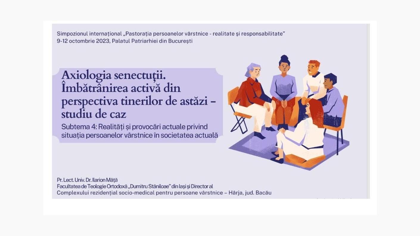 În perioada 9-12 octombrie 2023, la Palatul Patriarhiei din București s-a desfășurat Simpozionul Internațional de Teologie „Pastorația persoanelor vârstnice – realitate și responsabilitate”, reunind reprezentanți ai instituțiilor de stat, ierarhi, preoți, profesori și specialiști din țară și din străinătate. Simpozionul a fost organizat de Patriarhia Română, prin Sectorul Teologic-Educaţional, în cooperare cu Facultatea de Teologie Ortodoxă Justinian Patriarhul a Universității din București, cu sprijinul Secretariatului de Stat pentru Culte, și a reprezentat un eveniment semnificativ în cadrul manifestărilor prilejuite de Anul omagial al pastorației persoanelor vârstnice.
