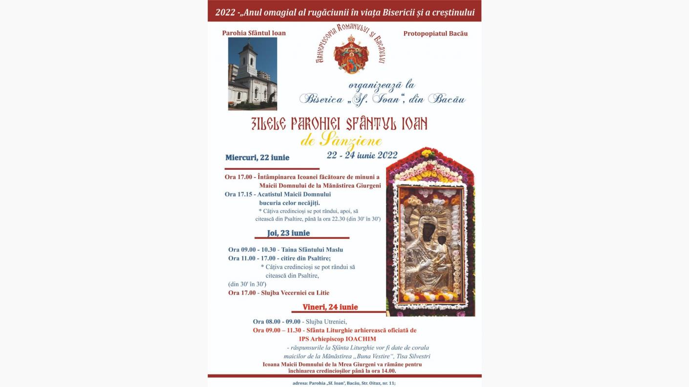 Ziua hramului a fost precedată de aducerea icoanei făcătoare de minuni a Maicii Domnului de la Giurgeni, așteptată cu emoție de credincioșii care au petrecut alături de ea trei zile în rugăciune, cu binecuvântarea preoților Marius Popescu, Gelu Chiribău, Ioan Apostu, slujitori în această parohie. În fiecare an, Zilele Parohiei Sfântul Ioan devin prilej de participare la "școala de rugăciune", instituită prin citirea neîntreruptă din Psaltire, slujba Sfântului Maslu, slujba Vecerniei unite cu Litia, acatiste și paraclise. (Mioara Ignat)