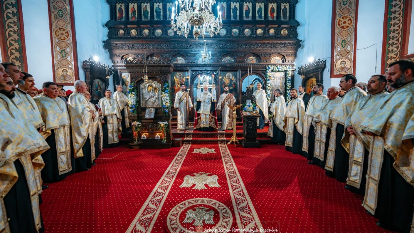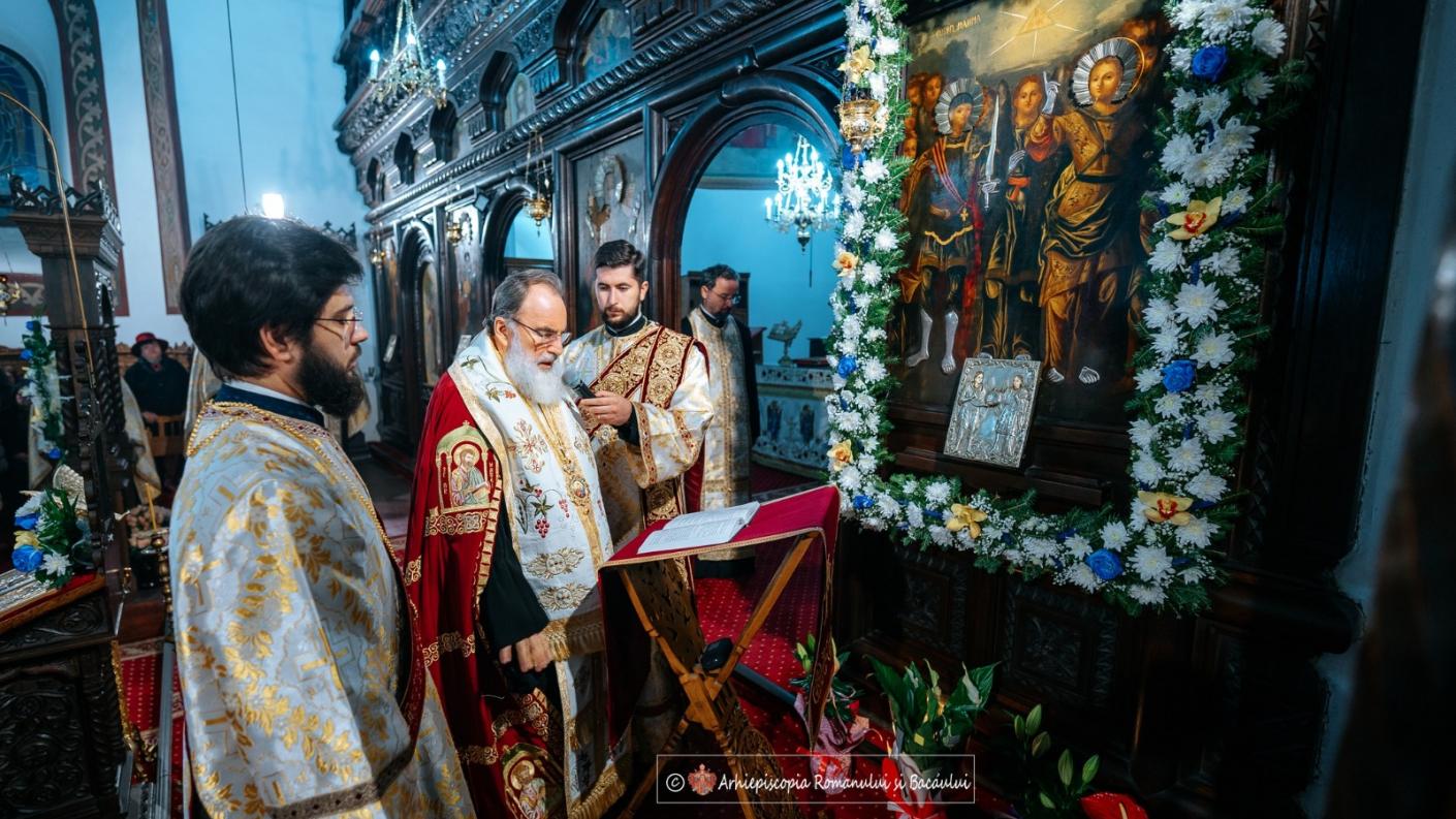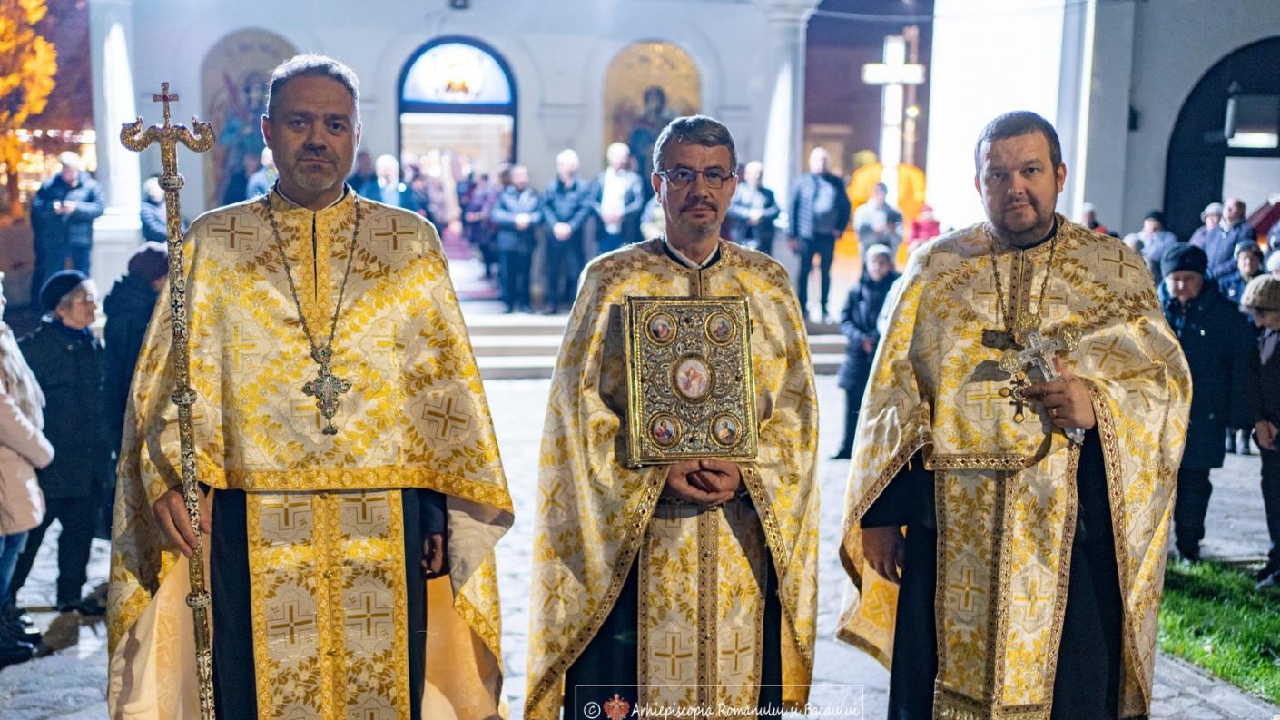 Un sobor format din preoți slujitori ai bisericilor din municipiul Roman, coordonați de părintele protopop Dan Alexandru Antoce, a slujit la Vecernia hramului bisericii, în prezența credincioșilor veniți să se roage în locașul de cult al căror patroni sunt Sfinții Arhangheli Mihail și Gavriil. Venirea ierarhului la slujba de seară a adus emoție în rândul celor prezenți, alături de care Înaltpreasfințitul Părinte Ioachim s-a rugat atât la sfinții patroni ai bisericii, cât și la Născătoarea de Dumnezeu, în dreptul unuia dintre odoarele bisericii, o copie a icoanei Prodromița, realizată în 1910, psalmodiind cu multă evlavie rugăciuni scrise de Înaltpreasfinția Sa în cinstea Maicii Domnului și a sfinților voievozi ai oștilor cerești.