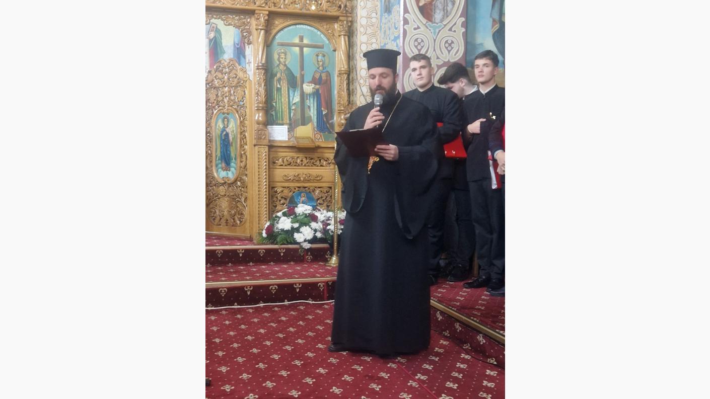 „Între oamenii care au bunăvoire se sălășluiește pacea pe pământ! Se vede din prestația voastră, dragi elevi, că ați probat bunăvoire în dobândirea cunoștințelor predate de profesori, iar prestația voastră e în măsură să ateste că ați petrecut multe ore repetând, renunțând în acel timp la preocupări comune, cărora le-ați fi dat curs dacă nu v-ați fi ostenit pentru ceea ce ați deprins. Sunt aici să vă aduc binecuvântarea Înaltpreasfințitului Părinte Ioachim, dar și să transmit dacă rânduiala așezământului de învățământ teologic este cea potrivită, dacă în sânul acestei comunități elevii primesc bunele învățături de la profesorii lor, și, din ceea ce voi ați făcut cunoscut prin colinda voastră, școala are rânduială, iar roadele învățăturii se pot vedea, cu satisfacție. Mi s-a transmis că acesta este spectacolul cel mai important dintr-o suită de douăzeci și cinci de reprezentații programate în acest an pentru a aduce bucuria sărbătorii Nașterii Domnului creștinilor ce vin să vă asculte, așadar vă urăm succes să vă duceți la capăt cu bine misiunea pe care v-ați asumat-o. Totodată felicităm părinții slujitori ai acestei biserici, care s-au implicat în buna realizare acestui eveniment.”