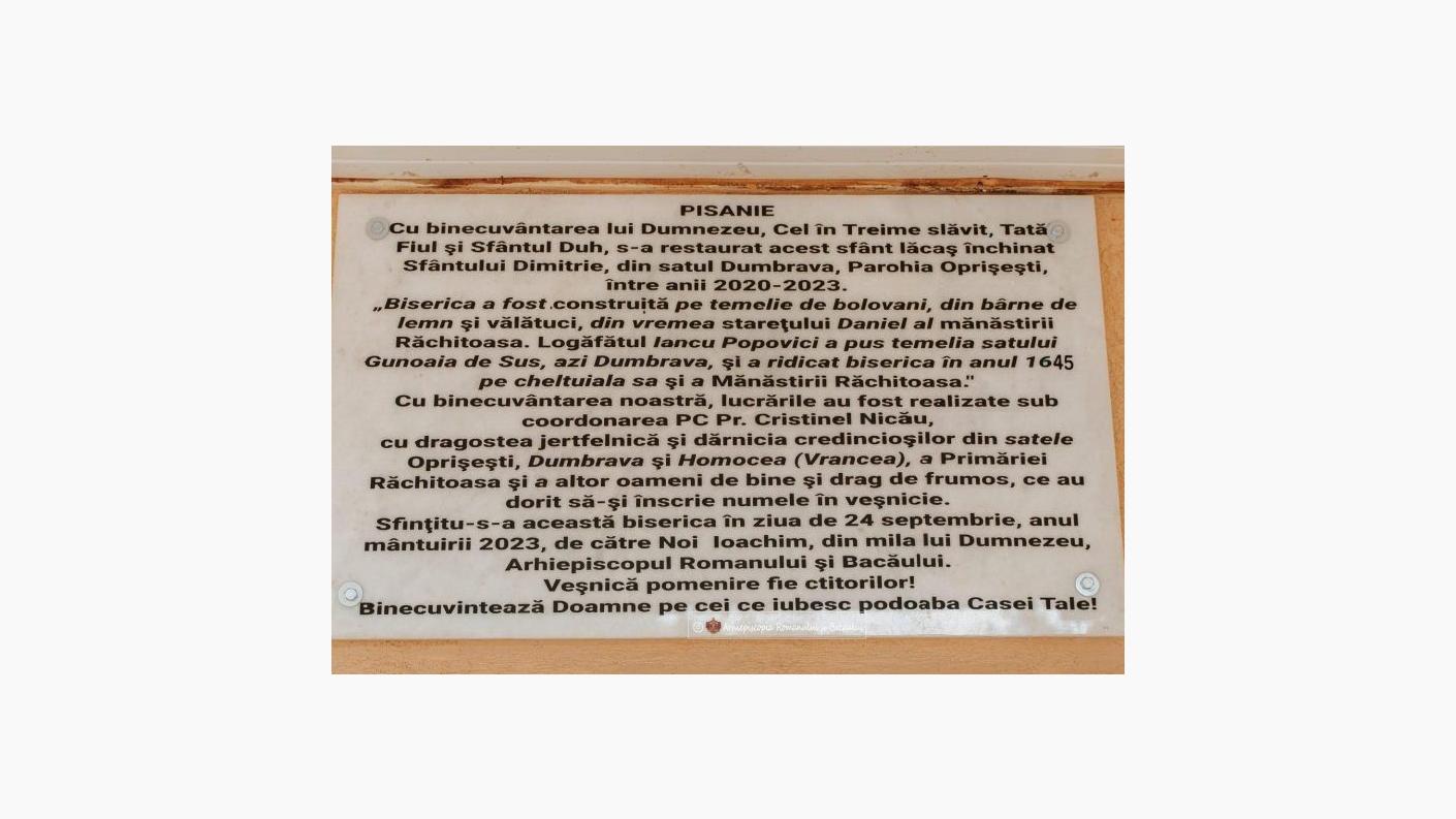 Duminică, 24 septembrie 2023, Înaltpreasfințitul Părinte Arhiepiscop Ioachim a fost prezent în mijlocul comunității din satul Oprișești, Protoieria Bacău, pentru a resfinți biserica cu hramul „Sfântul Dimitrie – izvorâtorul de mir”, după ce în decurs de trei ani au fost derulate ample lucrări de restaurare.