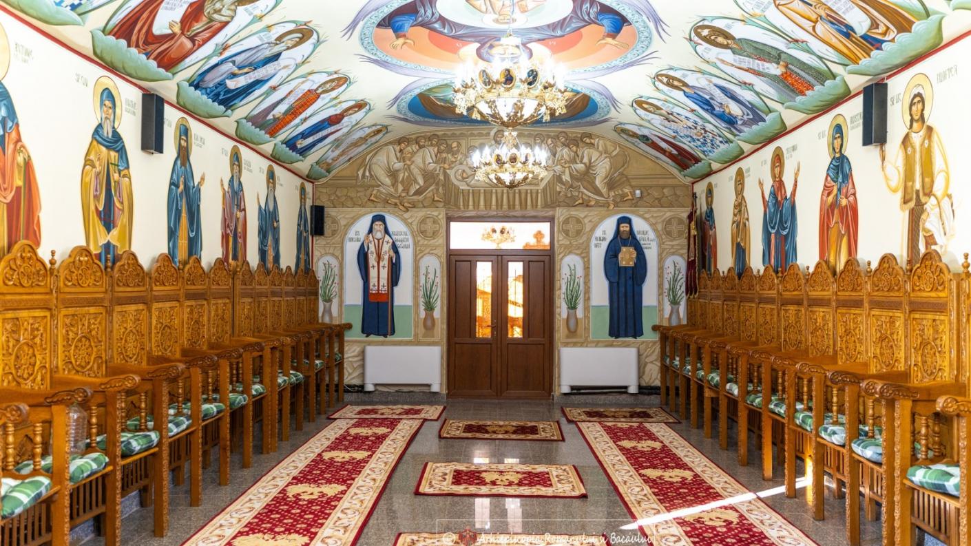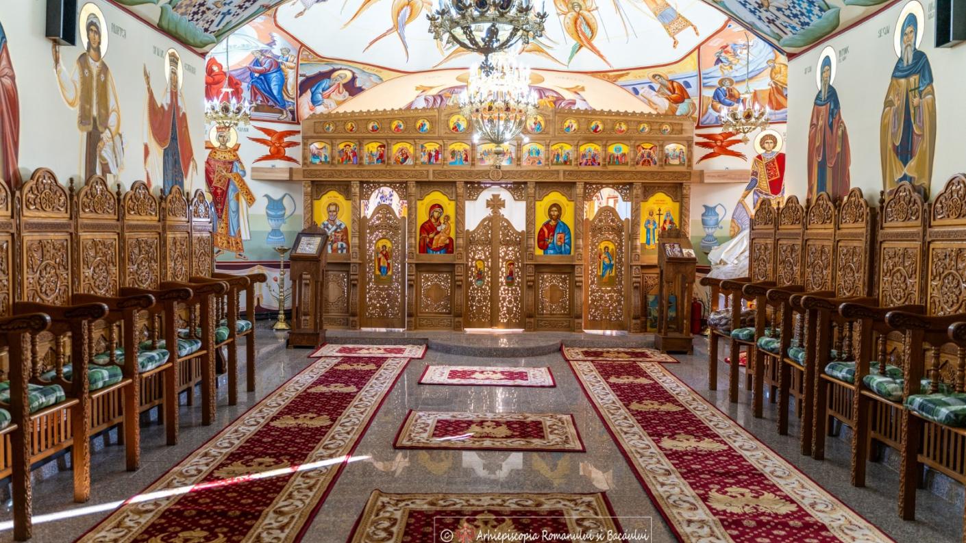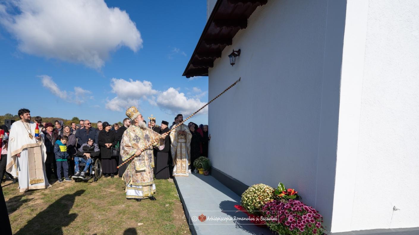 În sunetul clopotelor și al cântărilor sfinte, soborul slujitorilor a înconjurat lăcașul de cult oprindu-se în cele patru puncte cardinale pentru a citi pericopele evanghelice specifice acestui înălțător moment și pentru a stropi cu apă sfințită și a pecetlui cu Sfântul și Marele Mir pereții exteriori ai edificiului. Apoi, după rugăciunile înălțate la intrarea în noul lăcaș de cult, Înaltpreasfințitul Părinte Ioachim a sfințit masa Altarului, așezând în piciorul ei o casetă ce conține un fragment din Sfintele Moaște ale Sfântului Ierarh Mărturisitor Teodosie de la Brazi, unul dintre cei patru sfinți ai Romanului, catapeteasma cu icoane, precum și pictura murală.