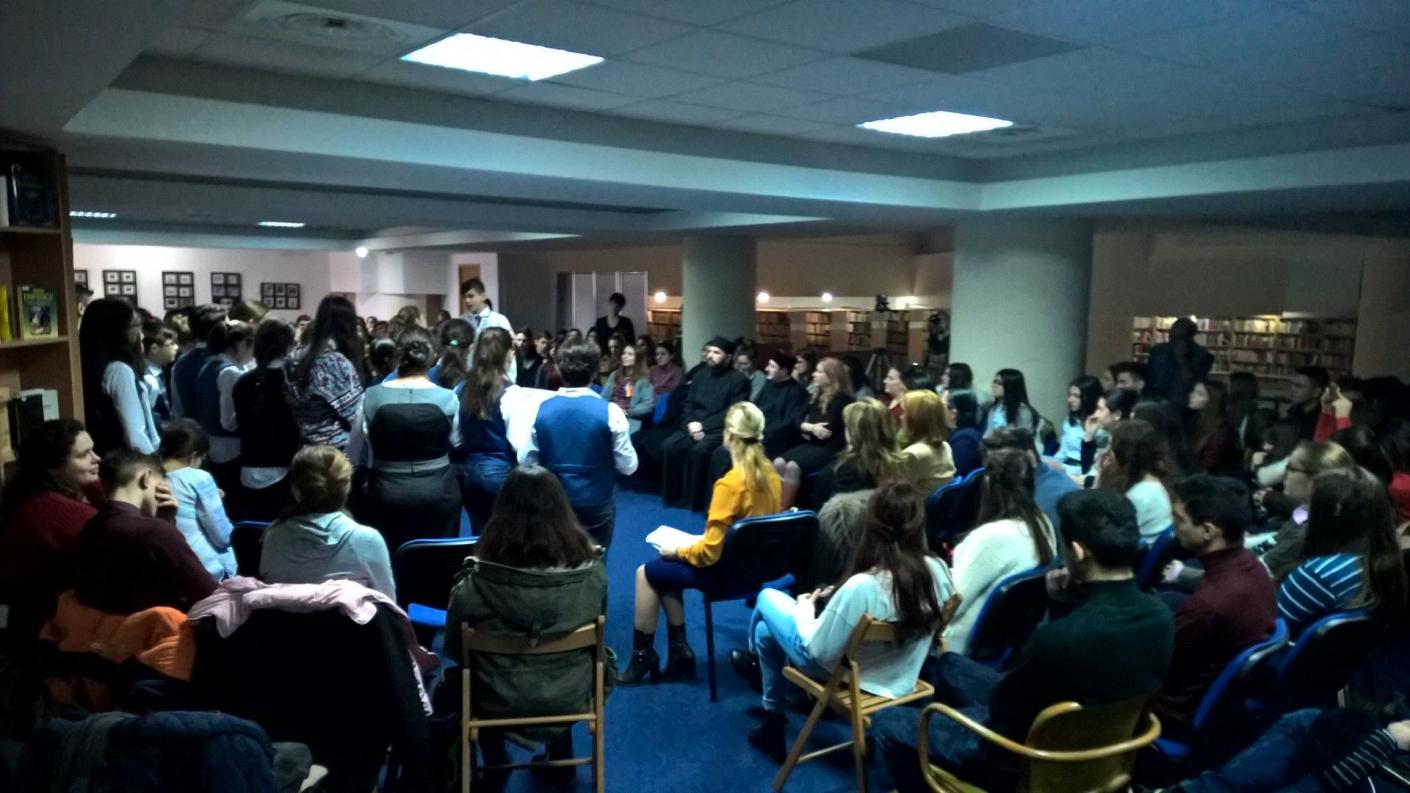 Profesori universitari, preoți, profesori din ciclul gimnazial și liceal, bibliotecari, alături de elevi ai claselor V-XII de la Școala nr. 10 și Colegiul ”Mihai Eminescu” au serbat ”Ziua culturii naționale” astăzi, 13 ianuarie, cu începere de la ora 11.00, la Biblioteca Județeană ”C. Sturdza”, prin manifestarea culturală ”Eminescu și școala românească”. Evenimentul a fost deschis cu un program artistic prezentat de elevii Școlii nr. 10, care, prin muzica corală, recitaluri de poezie și mici scenete au oferit imaginea admirației tinerei generații față de marele poet. Întâlnirea a fost urmată de cuvântul prof. dr. Adrian Jicu, directorul instituției de cultură băcăuane, care a mulțumit tuturor celor prezenți, implicați în acest moment de cultură și spiritualitate, evidențiind importanța colaborării între Biserică, Școală și Bibliotecă în vederea formării și educării morale și intelectuale a tinerei generații. Un cuvânt aparte de mulțumire a fost adresat Înaltpreasfințitului Părinte Arhiepiscop Ioachim, ierarh susținător și promotor al culturi în această zonă a Moldovei, care, în cuvântul transmis cu acest prilej, i-a binecuvântat pe profesori și elevi, îndemnându-i pe cei din urmă să citească și să aprofundeze inclusiv creația poetului nepereche al românilor. Mesajul de binecuvântare a fost citit de preotul protopop Costică Busuioc, delegat al Înaltpreasfinției Sale, dimpreună cu preotul inspector Constantin Gherasim. ”Încercăm să ne structurăm identitatea privind spre marii oameni de cultură ai acestui neam și de aceea Îi mulțumim lui Dumnezeu că ne-a învrednicit să ajungem și acest moment, iar pe tineri îi îndemn să-și amintească de această zi și să studieze pe toți scriitorii culturii românești, care au dat identitate neamului nostru”, a menționat, printre altele ierarhul în cuvântul său. Totodată, din partea ÎPS Arhiepiscop Ioachim, directorului Bibliotecii Județene, i-au fost dăruite mai multe volume apărute la Editura ”Filocalia” a Eparhiei Romanului și Bacăului. Sărbătoarea a continuat cu prezentarea revistei ”Orizonturi noi”, publicație a Societății Culturale a elevilor și profesorilor din Colegiul ”Mihai Eminescu”, urmată de un frumos și emoționant program artistic, pe versuri eminesciene, realizat de elevii colegiului băcăuan.