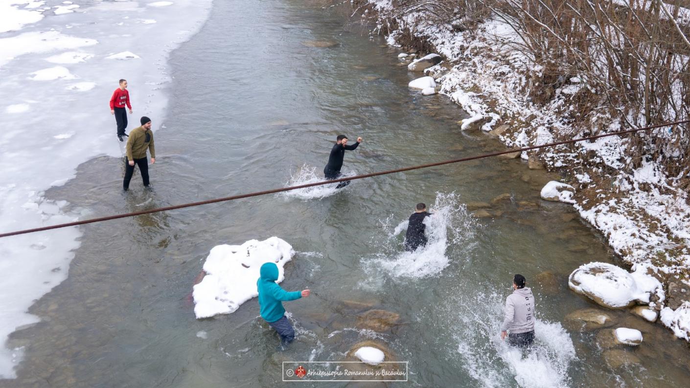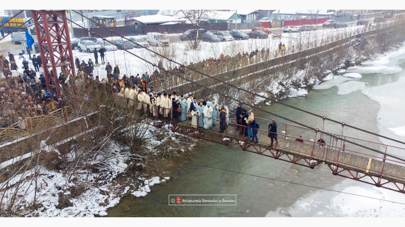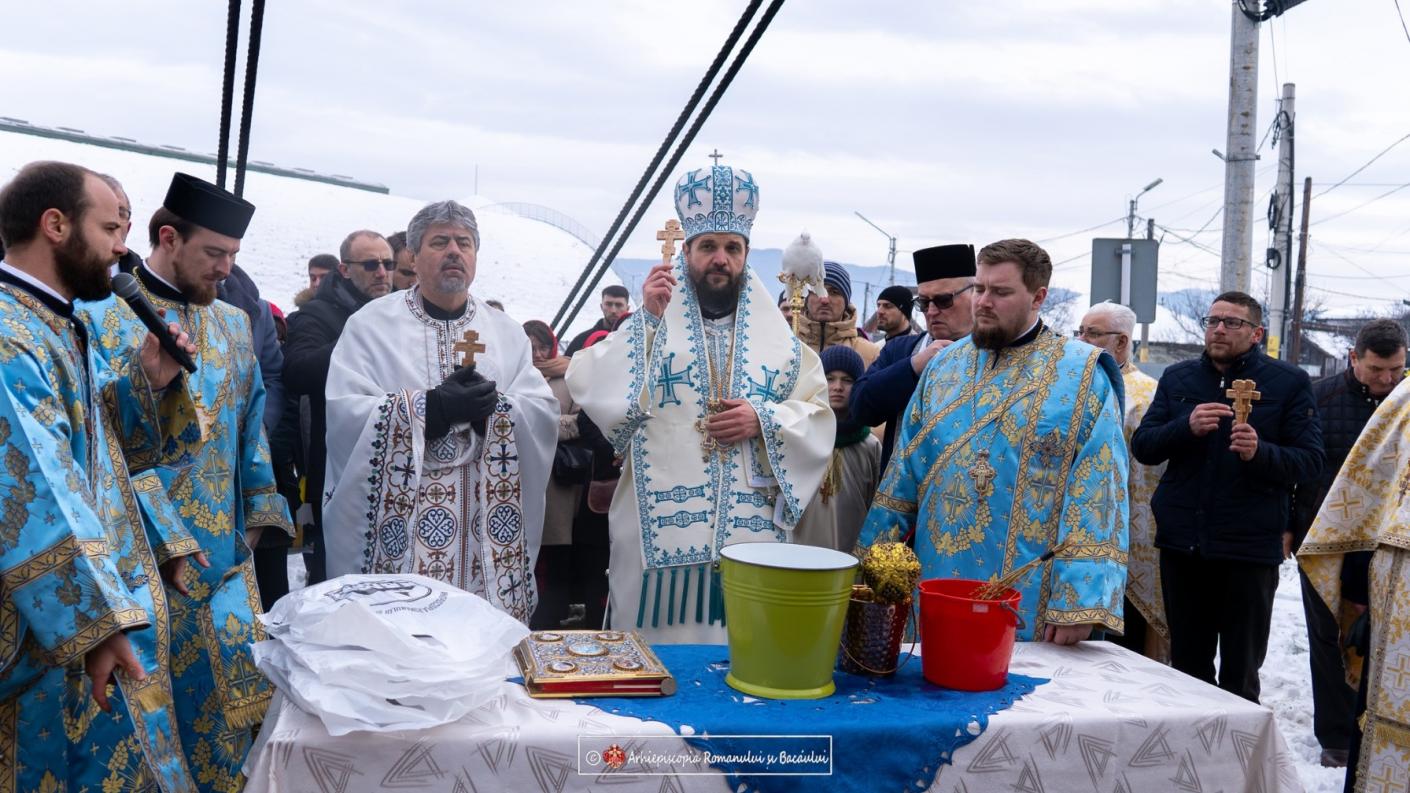 Procesiunea a continuat apoi spre râul Trotuș, la puntea din apropierea Centrului de Agrement „Ionuț Iftimoaie”, unde ierarhul a citit o rugăciune specială, după care, potrivit tradiției acestei mari sărbători, de pe pod au fost aruncate în apă trei Sfinte Cruci, marcând rânduiala sfințirii apelor. Cei care au recuperat crucile din apă, au fost felicitați, binecuvântați și au primit daruri din partea ierarhului.