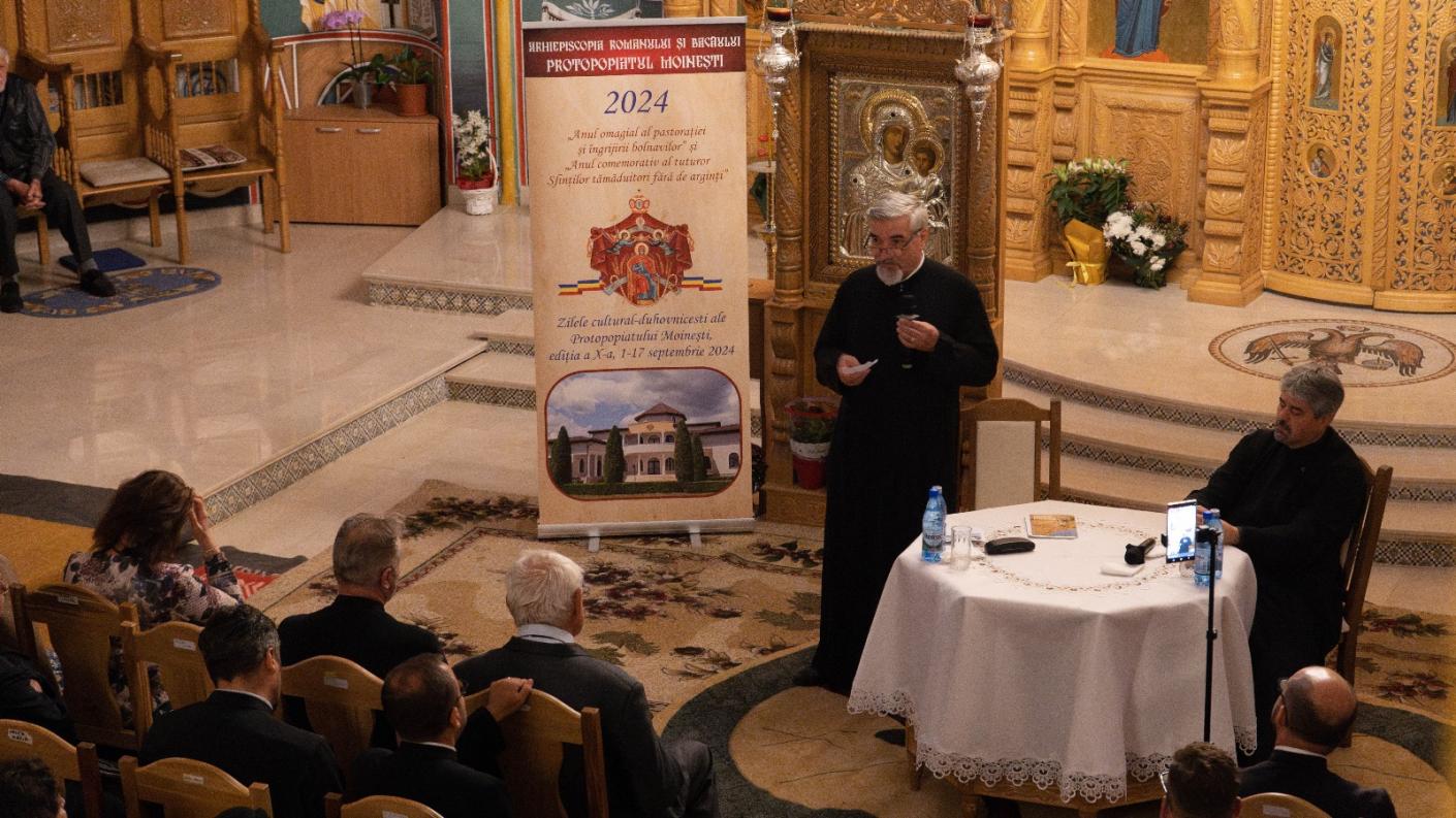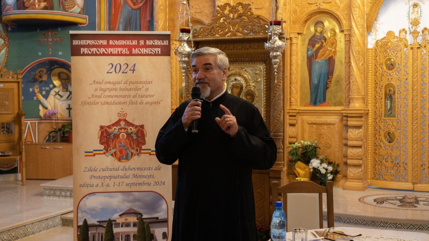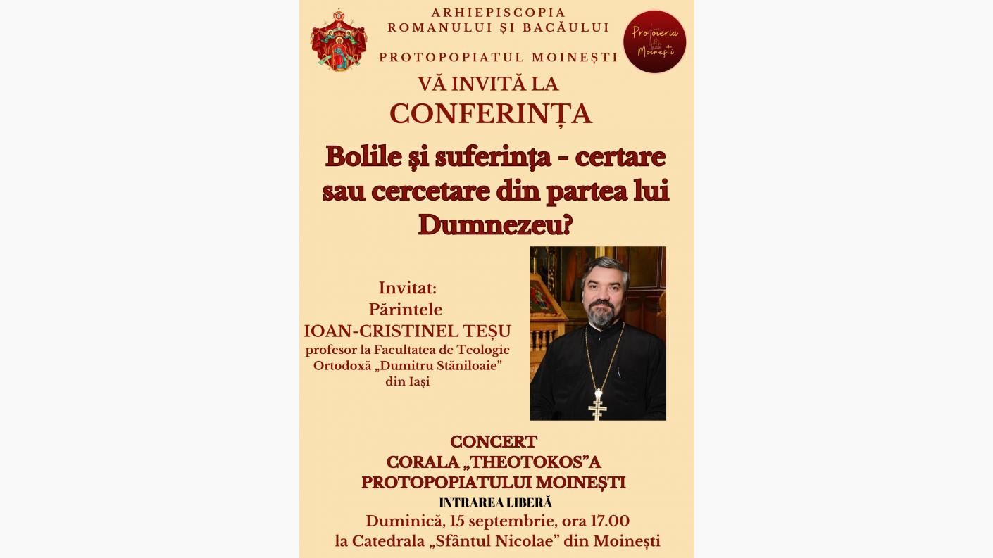 Astfel, în data de 15 septembrie, seara, în Catedrala „Sfântul Ierarh Nicolae” din municipiul Moinești, preoți și credincioși din tot cuprinsul Protopopiatului, au asistat la o prelegere deosebită susținută de părintele profesor Ioan-Cristinel Teșu. Tema conferinței a fost „Bolile și suferința – certare sau cercetare din partea lui Dumnezeu?”, iar părintele a vorbit celor prezenți despre înțelesul duhovnicesc pe care trebuie să-l dea omul perioadelor de încercare din viața lui, subliniind faptul că rugăciunea este ancora de salvare a sufletului din valurile vieții. În continuare, părintele a amintit învățătura Sfântului Paisie Aghioritul, care spunea, referitor la suferințele oamenilor: Sfatul pe care îl dădea duhovnicescul părinte, în privința suferințelor contextuale, a încercărilor punctuale, era: „Simplificați-vă viața și stresul va fugi!”. Prin tot ceea ce făcea, Sfântul Paisie exersa „arta de a aduce gândul cel bun”, iar această artă o preda și celor care-l căutau. În vremuri grele, precum sunt cele actuale, și în momentele de încercare, Cuviosul Paisie Aghioritul asigura că „ajutorul lui Dumnezeu și al celor bineplăcuți Lui este mai puternic decât oricând”, și adăuga: „Binele este că nu ne părăsește Dumnezeu. Bunul Dumnezeu păzește cu amândouă mâinile Sale lumea contemporană. Mai demult o ocrotea numai cu una, astăzi, însă, în mijlocul atâtor primejdii în care trăiește omul, Dumnezeu îl păzește precum mama pe pruncul ei, atunci când începe să pășească. Astăzi, mai mult decât odinioară, ne ajută Hristos, Maica Domnului, sfinții, dar noi nu înțelegem”.