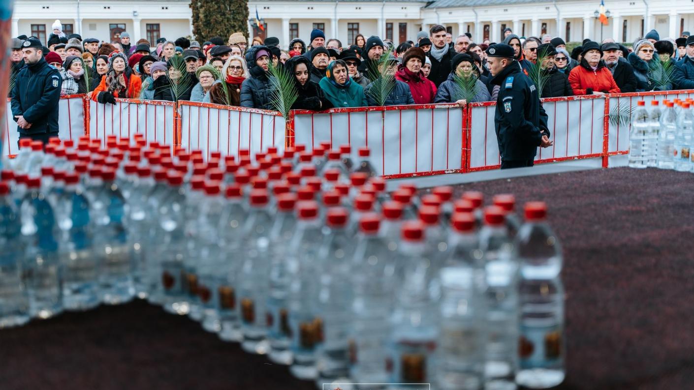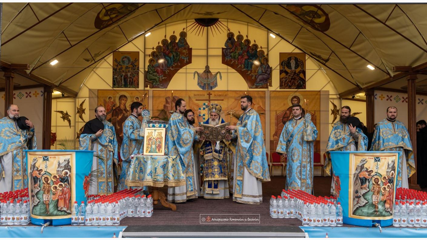 După săvârșirea Sfintei Liturghii în sfântul chivot romașcan, soborul preoților și diaconilor, cu podoabe sfinte în mâini, în glas de clopot și de cântări sfinte, a mers în procesiune spre altarul de vară din proximitatea Catedralei, special amenajat pentru săvârșirea slujbei de sfințire a apei.