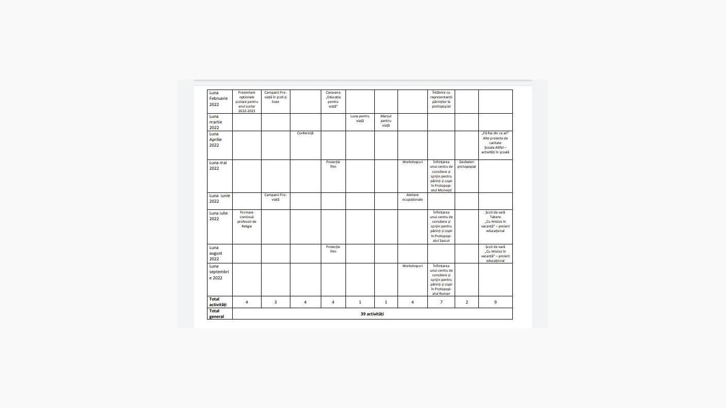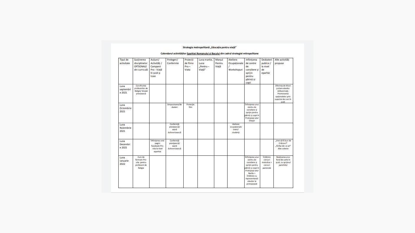 - Alte activități propuse (proiecte și programe sociale eparhiale, oferirea gratuită de kituri școlare, școali de vară cu caracter Pro-Vita, s.a.).