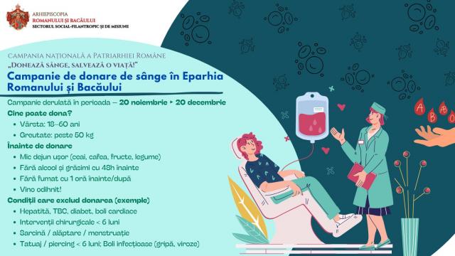 În perioada 20 noiembrie – 20 decembrie, Arhiepiscopia Romanului și Bacăului desfășoară, prin intermediul celor cinci protopopiate, o amplă campanie de donare de sânge, dedicată credincioșilor din eparhie și tuturor persoanelor care doresc să sprijine sistemul medical. Activitatea este organizată în parteneriat cu Centrele de Transfuzie Sanguină din județul Bacău și municipiul Roman și se înscrie în campania națională a Patriarhiei Române „Donează sânge, salvează o viață!”.