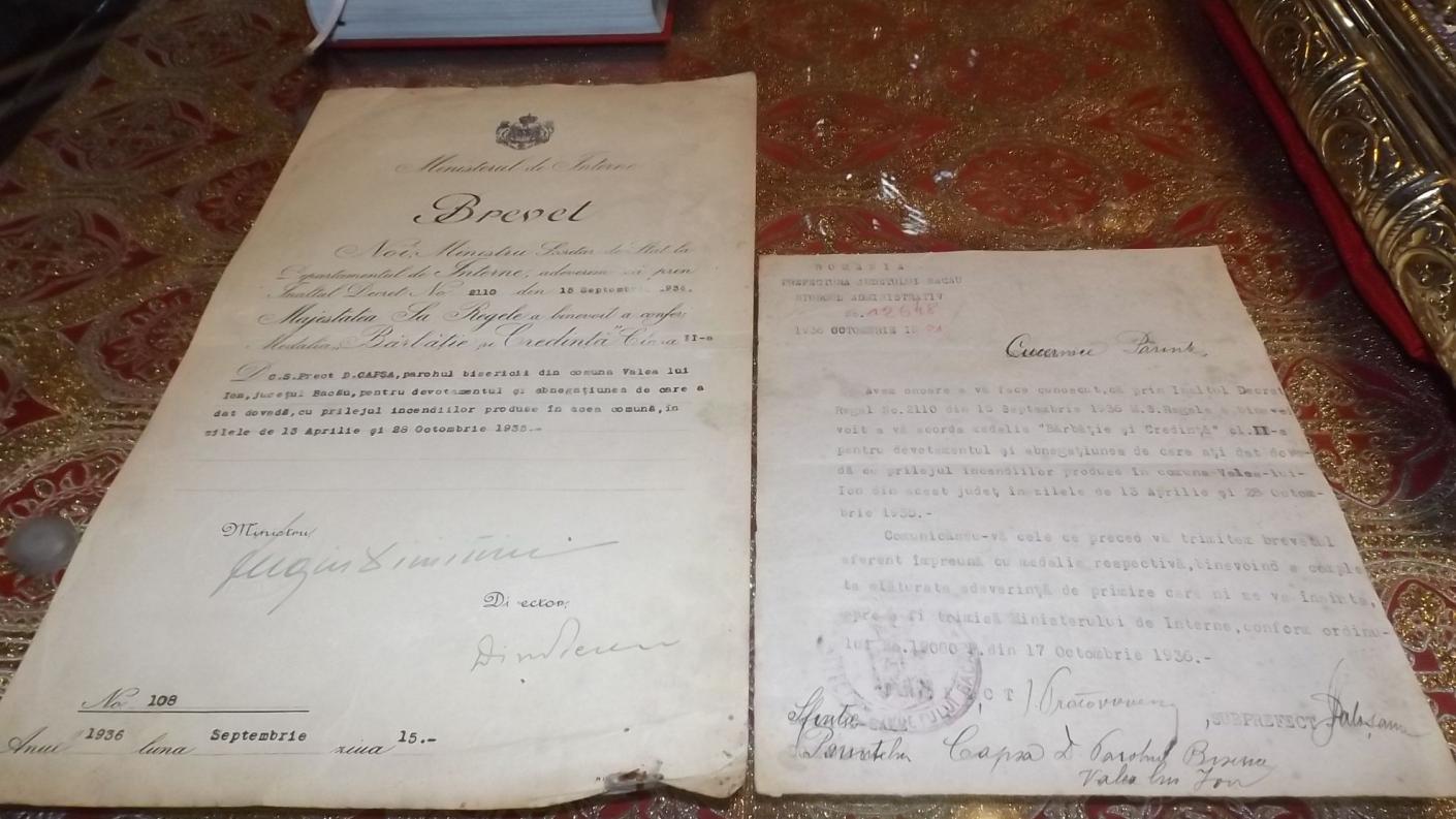 Un lucru inedit prezentat de părintele paroh a fost brevetul în original care atestă faptul că vrednicului de pomenire, părintelui Dumitru Capșa, i-a fost conferită în ziua de 15 septembrie1936, din partea Ministerului de Interne prin decretul Majestății Sale Regele Mihai, pentru implicarea deosebită în viața credincioșilor din comuna Blăgești, medalia „Bărbăție și Credință” clasa a II – a.