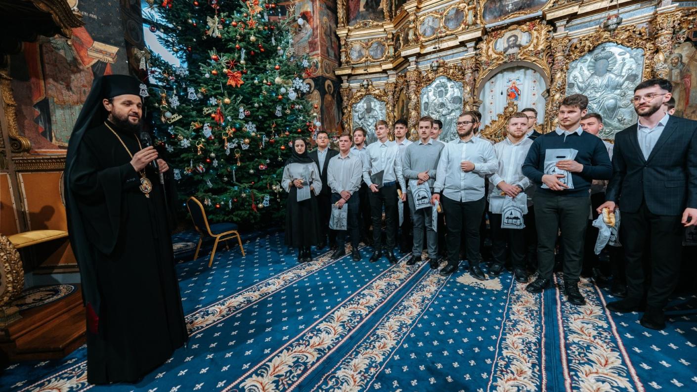 La finalul slujbei, potrivit frumoasei tradiții a perioadei premergătoare Praznicului Nașterii Domnului, cei doi ierarhi au primit cetele de colindători, prezentate de părintele Ilarion Mâță. Au colindat Grupul Seniorilor de la Fundația „Melchisedec”, Corul „Filomelos” din Onești, coordonat de părintele Petrică Cautiș și de doamna preoteasă Paula Cautiș, precum și grupul studenților teologi de la Iași, care au primit aprecieri și felicitări inclusiv din partea Preasfințitului Părinte Teofil, care s-a întâlnit cu aceștia în mai multe rânduri în cadrul activităților academice și pastorale din capitala Moldovei.