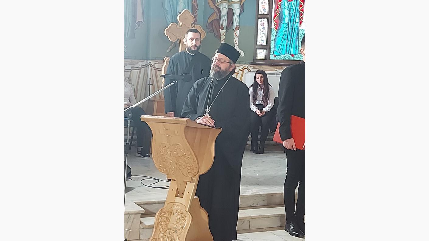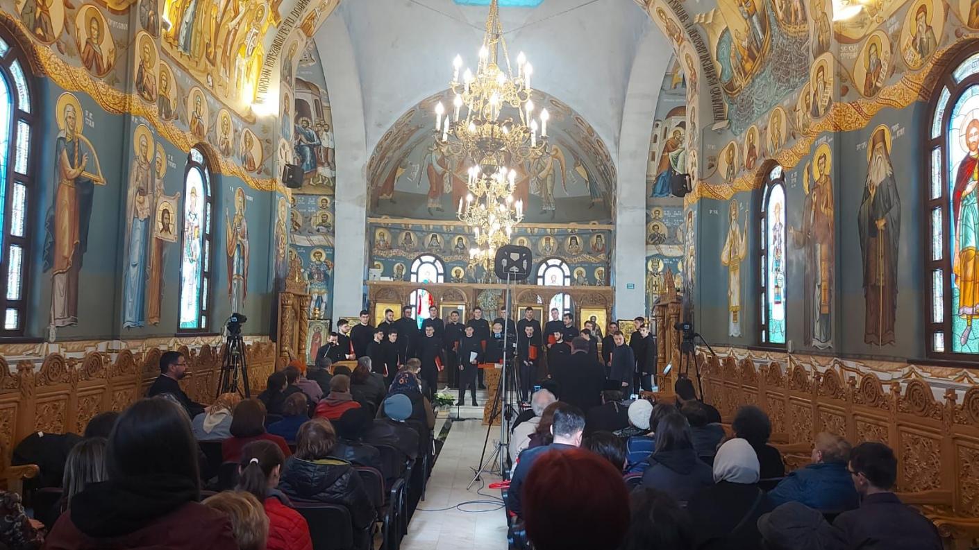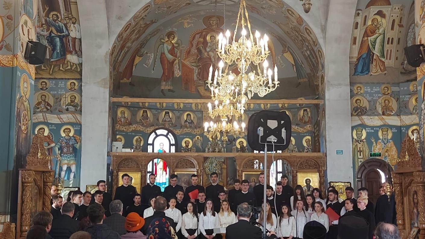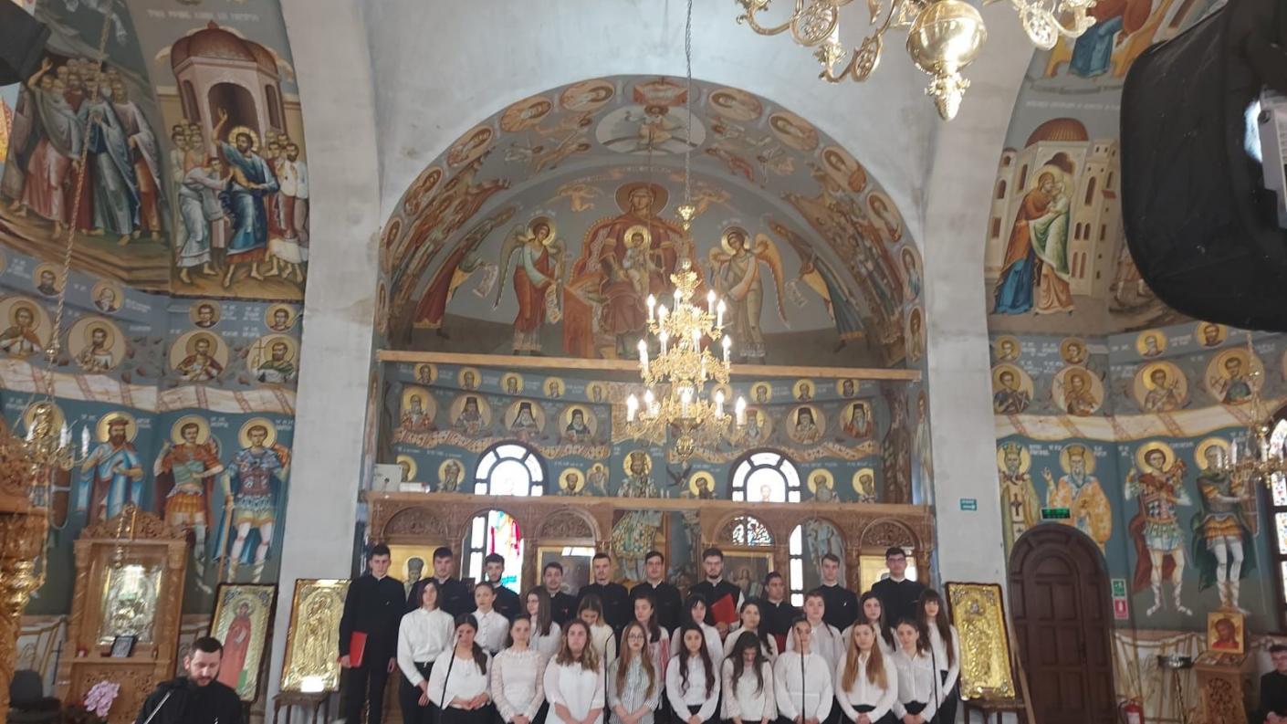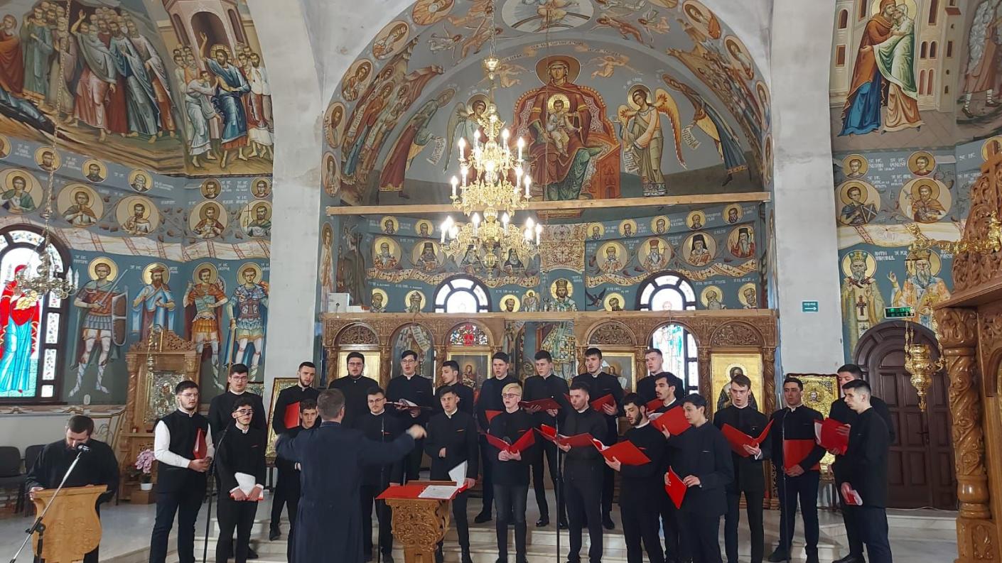 Elevii Liceului Teologic „Episcop Melchisedec” din Roman, deopotrivă băieți și fete, însoțiți și coordonați de profesorii lor, pr. prof. Vlad Samoilă și Arhid. Prof. Ioan-Alexandru Tecucianu, au interpretat următoarele cântări: Doamne al puterilor și Cu noi este Dumnezeu după melodie tradițională, La râul Babilonului de Dimitrie Suceveanu, Acum se intinge condeiul de Gherontie Nicolau, Aliluia și Cămara Ta Mântuitorule de Ioan Popescu Pasărea, Axion la Întâmpinarea Domnului, glasul III de Macarie Ieromonahul, Să se îndrepteze, glasul I de Ioan Popescu Pasarea şi Anton Pann, Stihiri la Prohod, glasurile V și III, Prochimen al Postului Mare glas VIII de Ioan Zmeu, Hristos a înviat glasurile II și VIII, Suflete al meu de Mihail Berezovschi, Heruvic duminical de Dragoș Alexandrescu, Çi era la ora a șasea de Gheorghe Mandicevschi.