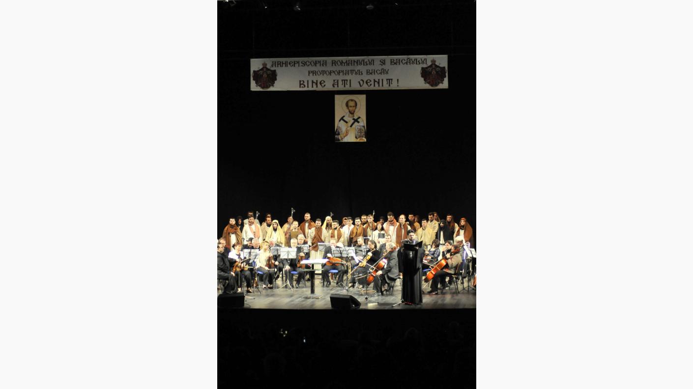 Un concert memorabil pentru iubitorii muzicii sacre. Așa a rămas în sufletele a peste o mie de băcăuani ”În vremea aceea”, fresca în nouă tablouri compusă de  Pr. Ion Popescu Runcu și susţinută de Corala „Armonia”, a Arhiepiscopiei Tomisului, pe scena Teatrului de Vară ”Radu Beligan” din municipiul Bacău. Melomanii prezenți în sală, împreună cu preoți veniți din tot județul, s-au putut împărtăși de frumusețea și expresivitatea unui festin muzical care a adus mai aproape emoția pregustării bucuriei pascale. O corală admirabilă ale cărei premii la nivel internațional confirmă faptul că Biserica susține și promovează muzica de înaltă calitate. ”Să nu uităm că din cele peste două mii de corale din țară, mai bine de trei sferturi sunt bisericești”, avea să precizeze, la finalul concertului, ÎPS Părinte Arhiepiscop Ioachim, pentru care seara muzicală de la Bacău s-a constitut într-un ”memento” special. Aceasta întrucât ÎPS Arhiepiscop Teodosie a făcut pomenirea părintelui arhidiacon Sebastian Barbu Bucur, personalitate de prim rang a muzicii bizantine, mutat la Domnul la 1 aprilie a. c, iar chiriarhul Eparhiei Romanului și Bacăului, ÎPS Părinte Ioachim, a rememorat câteva momente din prodigioasa activitate a ilustrului profesor universitar, alături de care, în calitate de imnograf al Bisericii Ortodoxe, a colaborat pentru realizarea muzicii slujbelor religioase pentru sfinții români canonizați după 1992.  ”Gândindu-mă la Sebastian Barbu Bucur îmi amintesc de utimele slujbe pe care le-am scris, respectiv a Sfântului Iachint de Vicina și a Sfântului Voievod Neagoe Basarab. Mi-au trebuit doar trei zile să le punem pe note, în condițiile în care, la altele trebuiau săptămâni și chiar ani. Ori Dumnezeu a rânduit ca topica muzicală și podobiile să iasă atât de frumos”, a menționat ÎPS Ioachim, iar ÎPS Teodosie a conchis:  Bacăul a devenit centrul spiritual care aduce omagiu părintelui Sebastian Barbu Bucur.”
