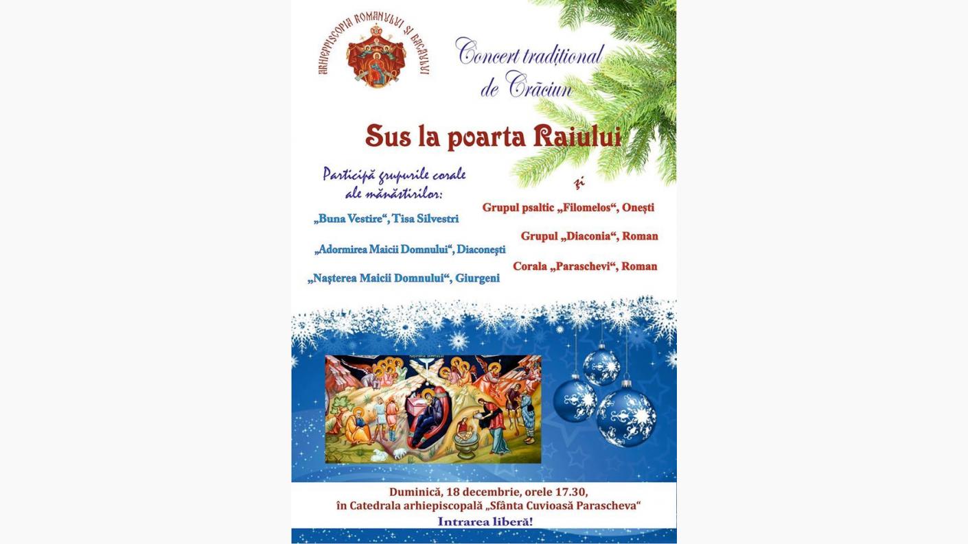 Apoi, în așteptarea serbării Crăciunului, în data de 18 decembrie, la ora 17.30, în Catedrala arhiepiscopală „Sf. Cuv. Parascheva” și în prezența IPS Părinte Arhiepiscop Ioachim va avea loc un alt concert desfășurat în urbea romașcană. Sub genericul nașterii Pruncului Mântuitor, concertul denumit “Sus la poarta Raiului” va reuni grupurile corale ale mănăstirilor „Buna Vestire” Tisa Silvestri, „Adormirea Maicii Domnului” Diaconești, „Nașterea Maicii Domnului” Giurgeni. Acestora li se vor alătura Grupul Psaltic „Filomelos” din Onești, Grupul „Diaconia” din Roman și Corala „Paraschevi” din Roman.