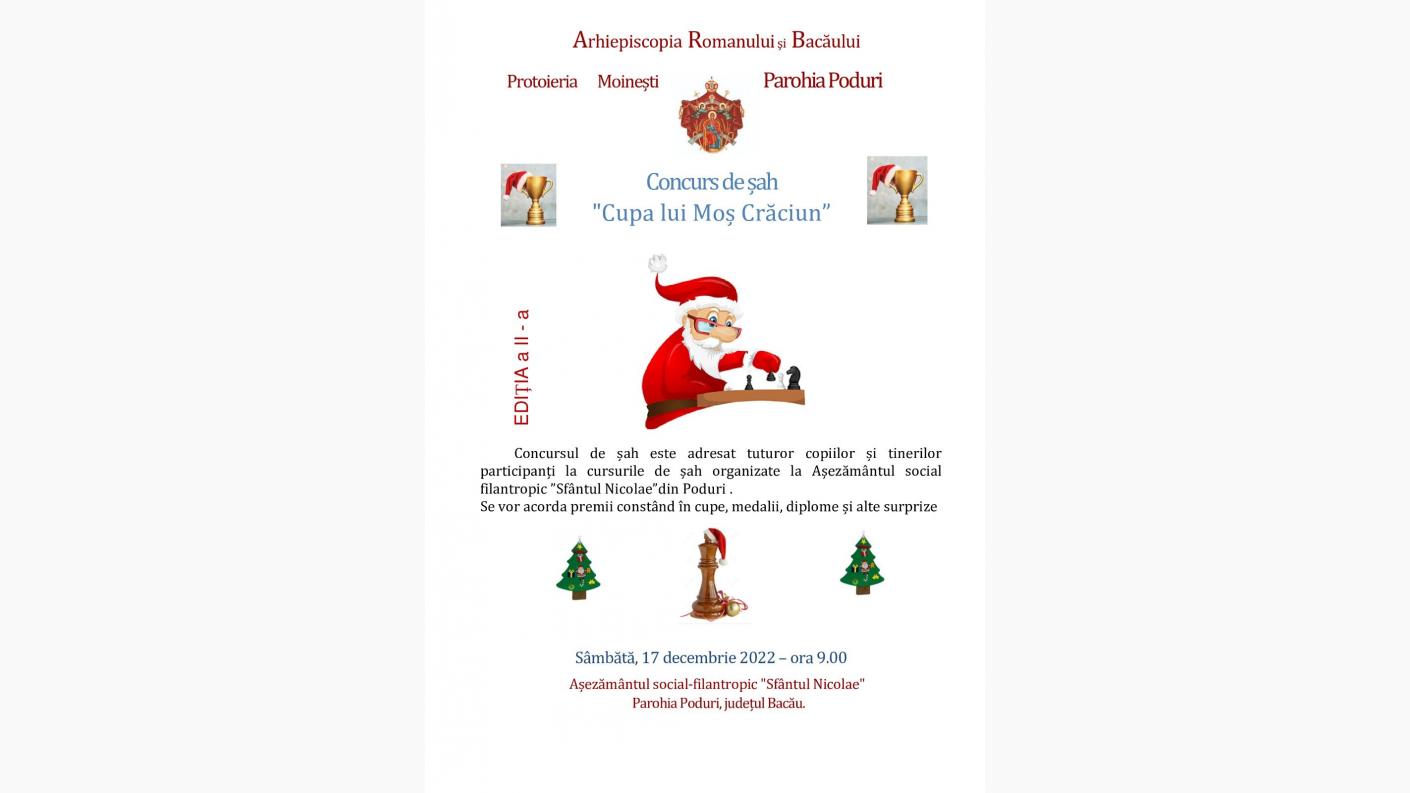 Cu binecuvântarea Înaltpreasfințitului Părinte Ioachim, Arhiepiscopul Romanului și Bacăului, sâmbătă, 17 decembrie 2022, la Așezământul social-filantropic „Sfântul Nicolae” din Parohia Poduri, Protopopiatul Moinești, a avut loc Concursul de șah „Cupa lui Moș Crăciun”, cu ocazia încheierii activităților educaționale și a cursurilor de șah desfășurate săptămânal cu tinerii și copiii în perioada martie-decembrie 2022.
