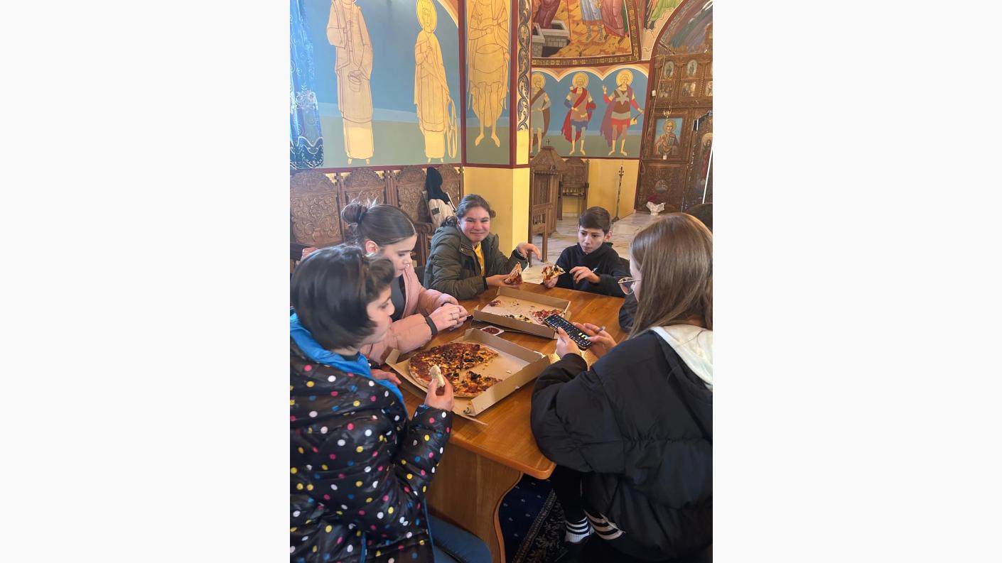 La sfârșit, copiii s-au bucurat de pizza, suc și dulciuri.