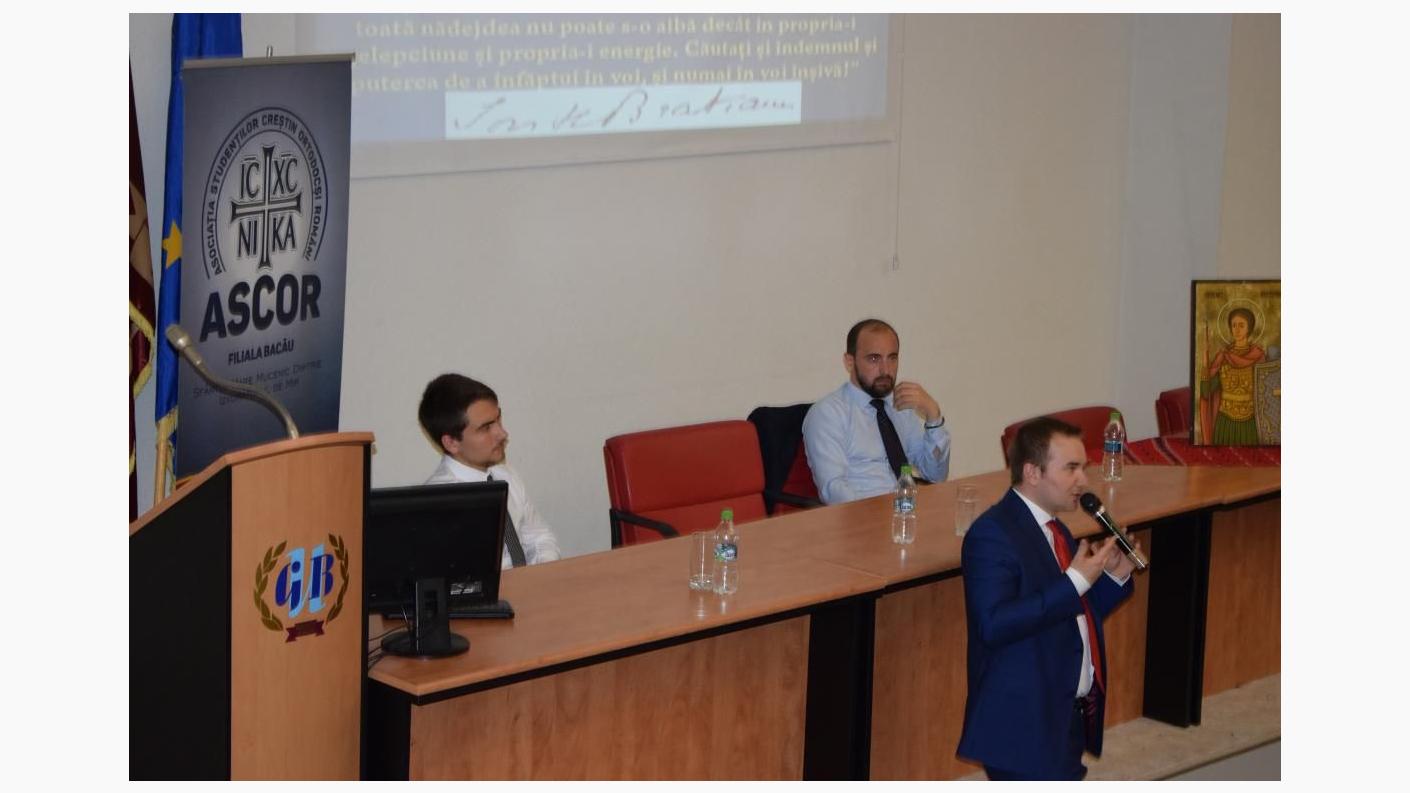 Joi, 7 iunie 2018, ora 18.00, în „Aula Mare” a Universității „George Bacovia” din Bacău, Asociaţia Studenţilor Creştini Ortodocşi Români – filiala „Sfântul Dimitrie” Bacău, a organizat conferinţa cu tema „Centenarul Marii Uniri”, invitatul serii fiind domnul Andrei-Daniel Gheorghe.
