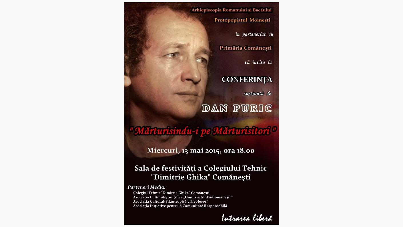 Cu binecuvântarea Înaltpreasfințitului Părinte Ioachim, Arhiepiscopul Romanului și Bacăului, şi în contextul Anului omagial al misiunii parohiei şi mănăstirii azi şi al Anului comemorativ al Sfântului Ioan Gură de Aur şi al marilor păstori de suflete din eparhii, Protopopiatul Moinești, în parteneriat cu Primăria orașului Comănești, organizează conferința “Mărturisindu-i pe Mărturisitori”, ce se va desfășura miercuri, 13 mai 2015, ora 18.00, în Sala de festivități a Colegiului Tehnic “Dimitrie Ghika” Comănești, având ca invitat pe actorul Dan Puric.