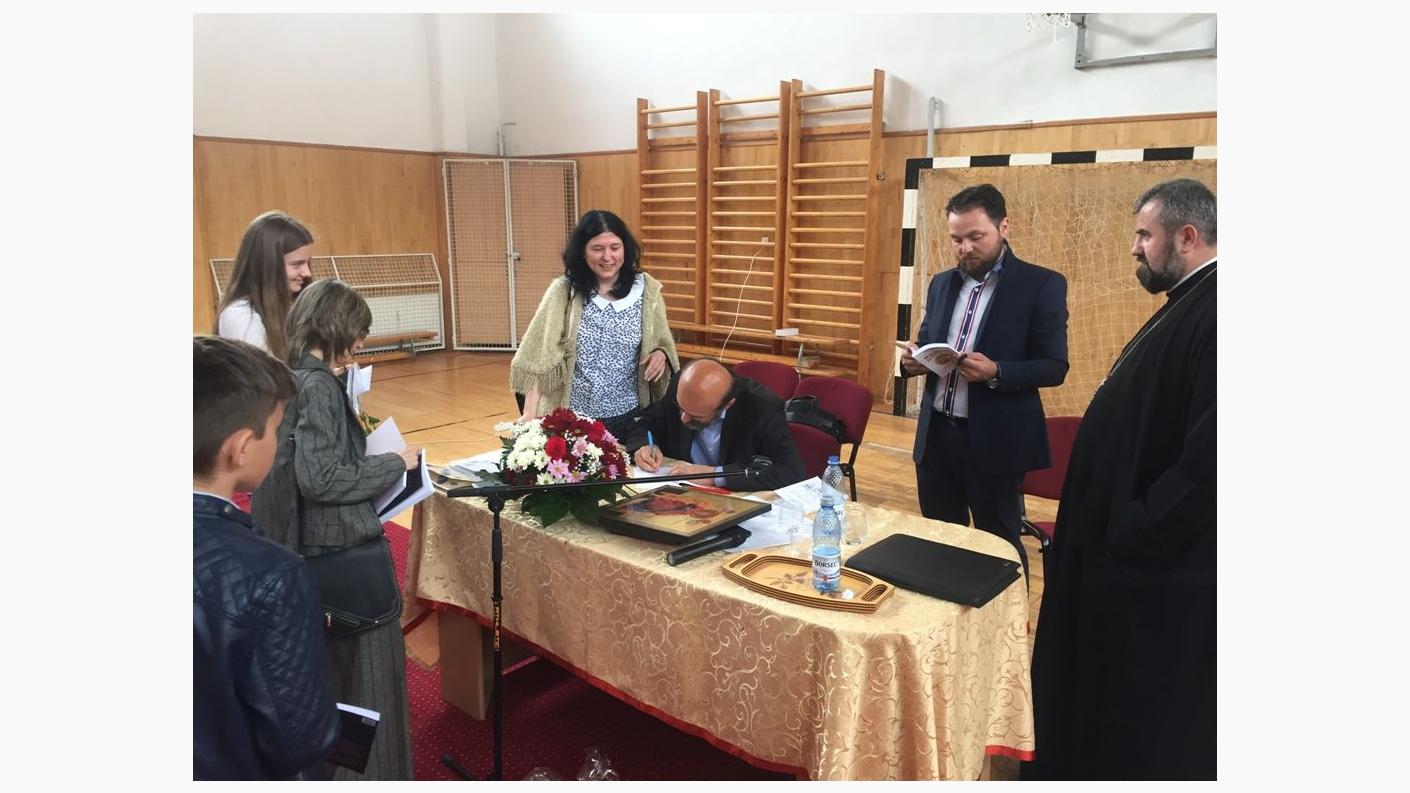 Prezent la întâlnire a fost și părintele Protopop Ioan Bârgăoanu, care a transmis un cuvânt de binecuvântare din partea Înaltpreasfințitului Părinte Ioachim, Arhiepiscopul Romanului și Bacăului, dar a și mulțumit, oferind diplome de excelență, icoane și cărți, celor doi distinși conferențiari, doamnei director Bereczki Mariana, gazdă a evenimentului, precum și Părintelui Constantin Jupenschi, pentru implicarea ca profesor de religie în activitățile cu elevii din Centrul de tineret și voluntariat ”Sf. Filofteea”