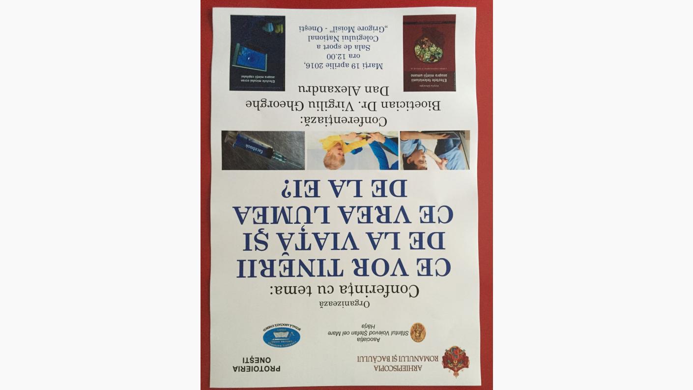 În contextul anului omagial dedicat educației religioase a tinerilor, cu binecuvântarea Înaltpreasfințitului Părinte Ioachim, Arhiepiscopul Romanului și Bacăului, Protoieria Onești, în parteneriat cu Asociația ”Sf. Voievod Ștefan cel Mare – Hârja”, Colegiul Național ”Grigore Moisil” și Școala Gimnazială ”Ghiță Mocanu” din Onești, a organizat marți, 19 aprilie 2016, un eveniment inedit prin care tineretul de la colegiile din orașul Onești a avut o ocazie deosebită de a participa la conferința cu titlul „Ce vor tinerii de la viață și ce vrea lumea de la ei?”