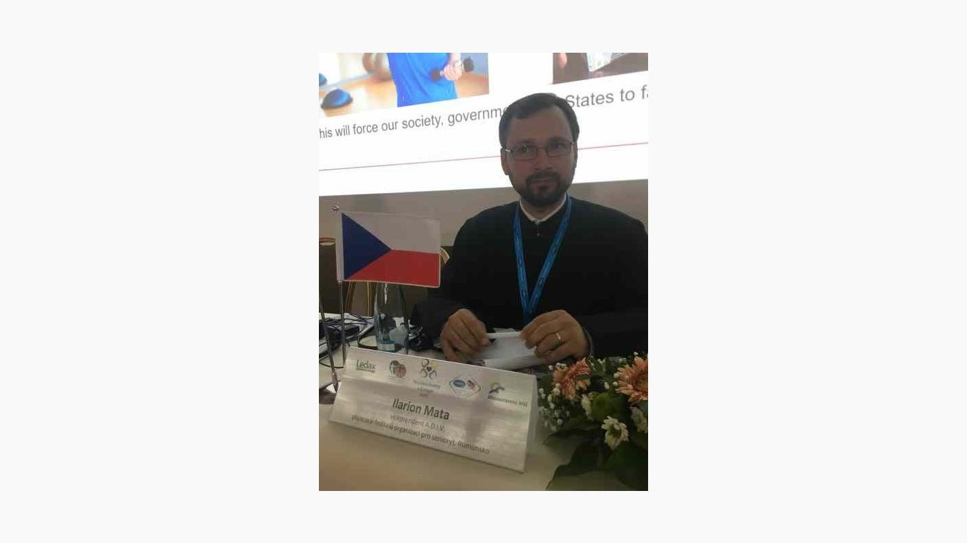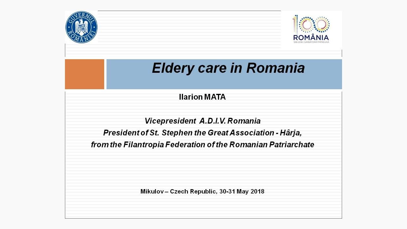 Având tema Elderly Care in Romania [Îngrijirea vârstnicilor în România], Pr. Ilarion Mata, Președinte al Asociației „Sf. Voievod Ștefan cel Mare – Hârja” din cadrul Federației Filantropia a Patriarhiei Române, Inspector eparhial la Sectorul Social – Filantropic al Arhiepiscopiei Romanului și Bacăului și Vicepreședinte al Asociației naționale a directorilor instituțiilor pentru vârstnici (A.D.I.V.) România, a prezentat date statistice oficiale referitoare la situația demografică actuală, sistemul național de asistența socială cu legislația în vigoare, servicii sociale publice și private, serviciile adresate vârstnicilor, finanțarea serviciilor de stat și private, finalizând cu prezentarea activităților socio – medicale pentru vârstnici, copii și adulți cu deficiență din cadrul Asociației „Sf. Voievod Ștefan cel Mare- Hârja”. Pr. Ilarion a evocat și rolul implicării active a Patriarhiei Române și a tuturor furnizorilor acreditați de servicii sociale licențiate ce aparține Bisericii Ortodoxe Române, fiind cea mai importantă instituție națională care oferă în permanență, atât prin parohii, cât și prin ONG-urile eparhiale, asistență medico - socială, educațională și culturală tuturor categoriilor de persoane vulnerabile din România și nu numai.