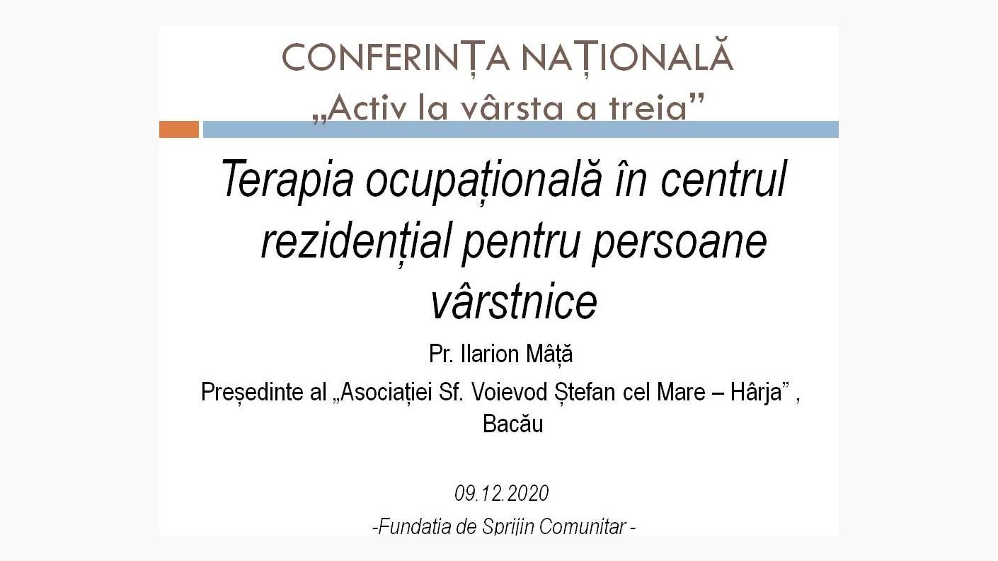 Asociația Sf. Voievod Ștefan cel Mare – Hârja, a reprezentat Federația Filantropia a Patriarhiei Române la Conferința națională „Activ la vârsta a treia”, desfășurată în perioada 9-10 decembrie 2020, ce a reunit peste 100 de participanți, profesioniști din domeniul îngrijirii pe termen lung.