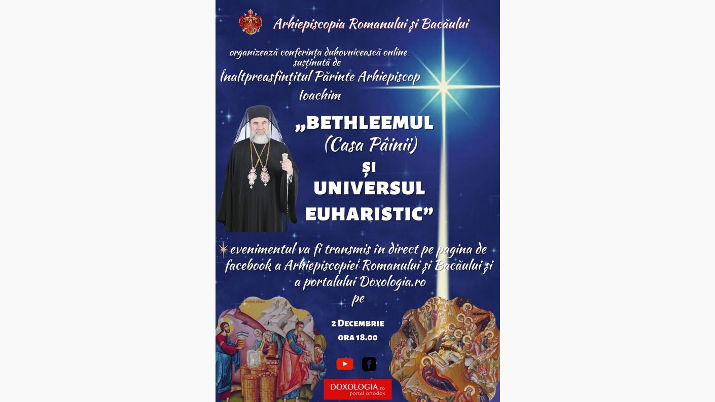 Arhiepiscopia Romanului și Bacăului organizează miercuri, 2 decembrie 2020 conferința duhovnicească online „Bethleemul (Casa Pâinii) și Universul Euharistic” ce va fi susținută de Înaltpreasfințitul Părinte Ioachim.
