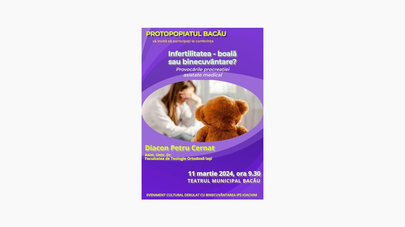 Luni, 11 martie 2024, cu binecuvântarea Înaltpreasfințitului Părinte Arhiepiscop Ioachim, și la inițiativa părintelui protoiereu Eugen-Ciprian Ciuche, la Teatrul Municipal „George Bacovia” din Bacău a avut loc conferința Pro Vita intitulată „Infertilitatea – boală sau binecuvântare? Provocările procreației asistate medical”, susținută de către diaconul Petru Cernat, asistent universitar doctor la Facultatea de Teologie Ortodoxă „Dumitru Stăniloae” din Iași.