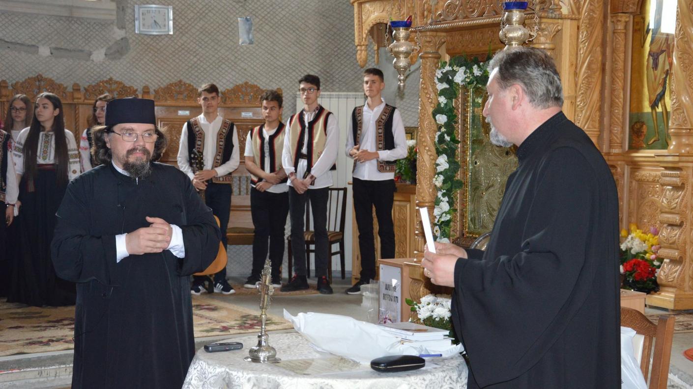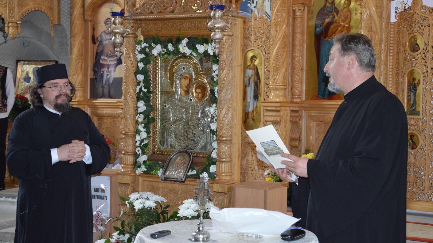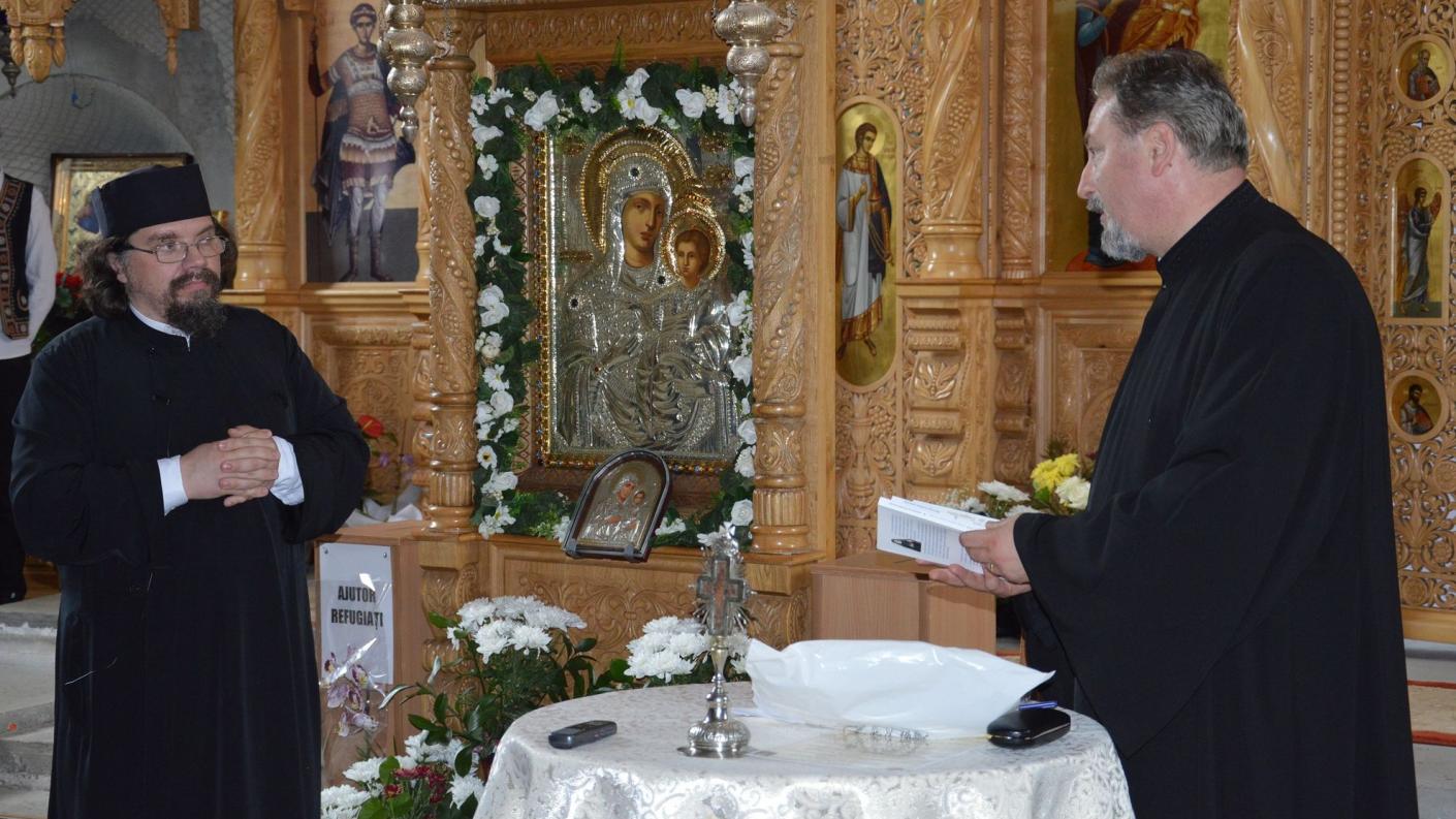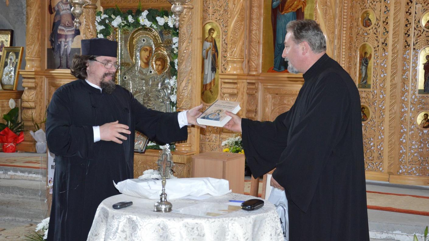 Părintele Daniel Enea a oferit în dar invitatului serii din partea Înaltpreasfințitului Părinte Ioachim câteva volume de cărți, apărute la editura Filocalia a Arhiepiscopiei Romanului și Bacăului, și care îl au ca autor pe Înaltpreasfințitul.