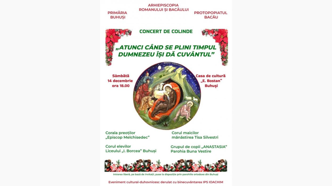 Concertul de colinde denumit „Atunci când se-mplini timpul, Dumnezeu Își dă Cuvântul” este o invitație la un eveniment cultural-duhovnicesc, prielnic urcușului sufletesc pe care îl propune Postul Nașterii Domnului. Sâmbătă, 14 decembrie 2024, începând cu ora 18.00, Protoieria Bacău, alături de Primăria Buhuși va oferi credincioșilor ocazia de a asculta o poveste care se va scrie în inima fiecăruia, prin note muzicale și voci în Casa de Cultură „Elisabeta Bostan”.
