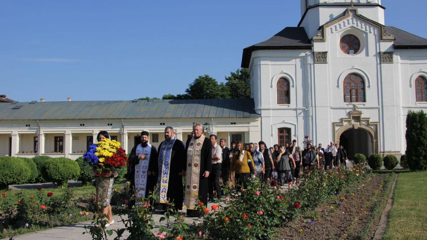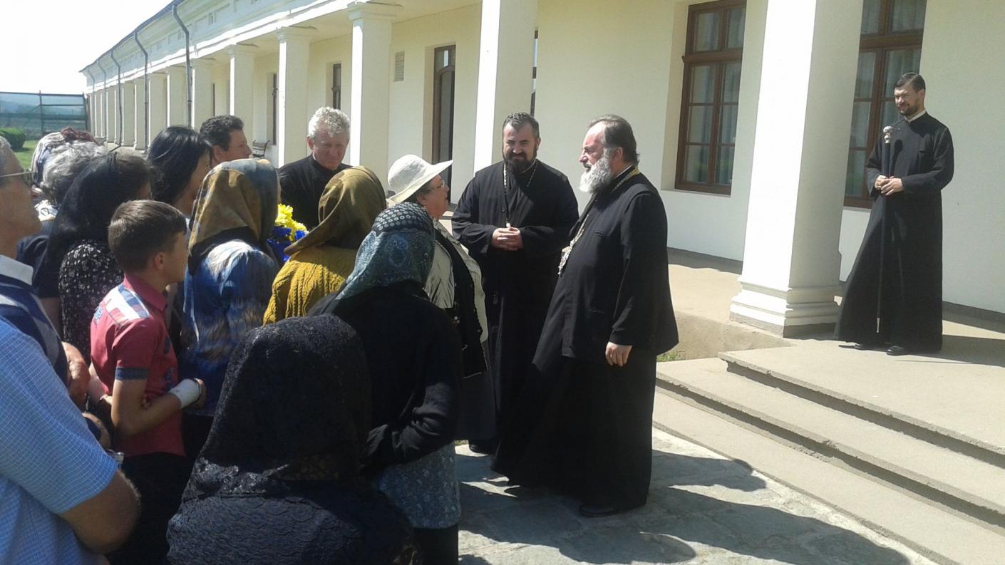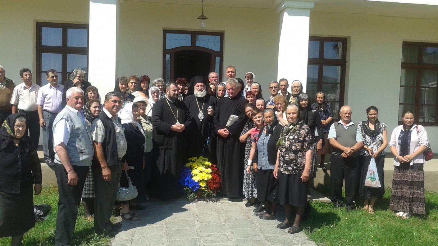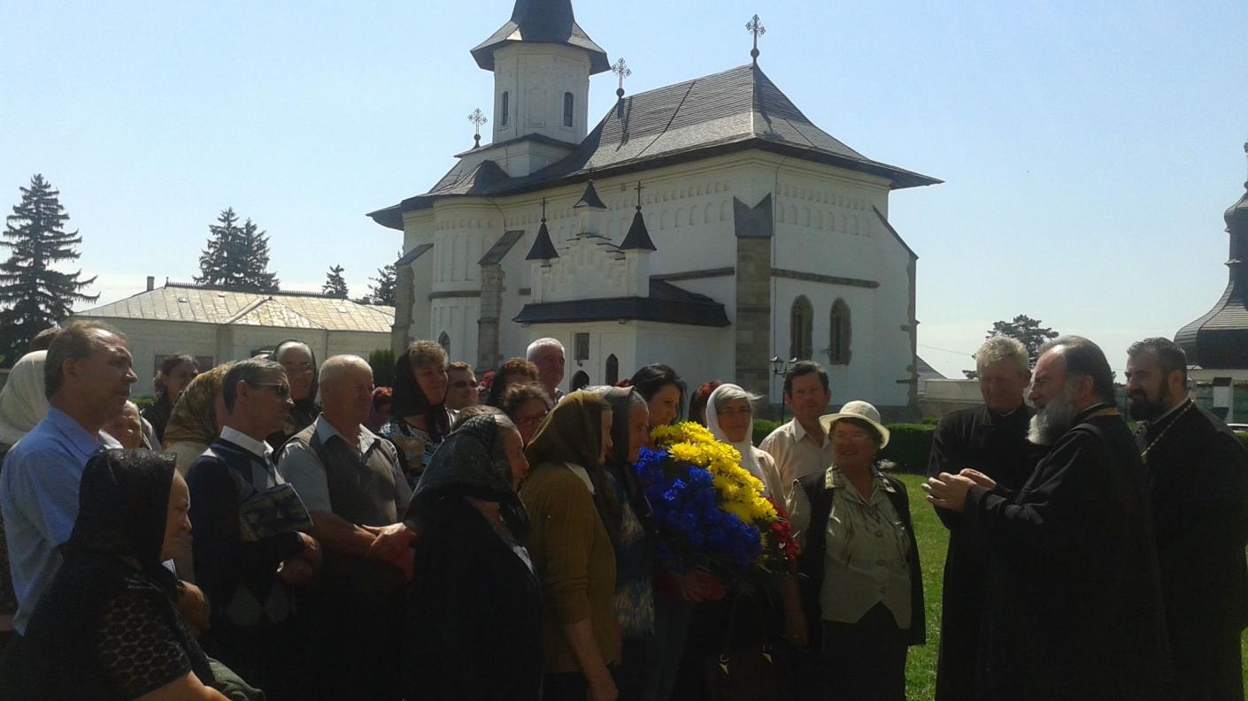 Astăzi, de dimineață pornind în pelerinaj, credincioșii mănăstireni au venit la Centrul eparhial însoțind racla cu sfintele moaște, pentru a-i mulțumi Sfintei Cuvioase Parascheva pentru binefacerile primite și pentru a mărturisi bucuria pe care au trăit-o în ziua în care, Preamilostivul Dumnezeu a rânduit să le fie sfințit rodul muncii lor de mai bine de 15 ani, frumoasa catedrală cu hramurile „Buna Vestire” și „Sfântul Simeon Noul Teolog”.