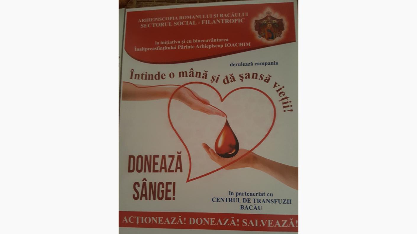 Statisticile au evidenţiat în ultimii ani că la fiecare trei secunde cineva are nevoie de sânge, o nevoie greu de acoperit de medici, în contextul în care doar doi români din 100 obişnuiesc să doneze. Activităţile propuse în acest proiect pot constitui o alternativă la soluţionarea uneia dintre cele mai grave probleme cu care se confruntă în prezent centrele de transfuzie sangvină: lipsa stocurilor de sânge şi preparate din sânge. Donarea de sânge este o responsabilitate a întregii societăţi, un semn de implicare civică şi de compasiune pentru pacienţii din spitale. De aceea, IPS Părinte Arhiepiscop Ioachim îndeamnă preoţii și credincioșii din toate parohiile Eparhiei Romanului şi Bacăului să vină în sprijinul persoanelor care au nevoie de sânge.